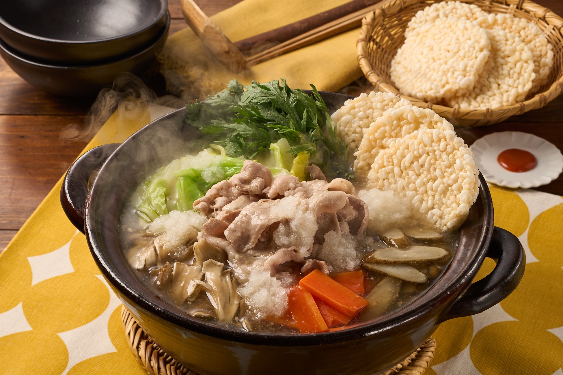概要:新潟・松之山温泉発祥の「棚田鍋」を、ご家庭でも楽しめる、冬らしい味わいの鍋Kitで再現しました。とろみのあるお出汁に、雪をイメージした大根おろしを浮かべた一品で、体の芯から温めてくれます。煮込むほどにもっちりと、お出汁をかければサクサクとした食感を楽しめるおこげもお楽しみください。新潟の発酵調味料「かんずり」を加えることで、味の変化もお楽しみいただけます。