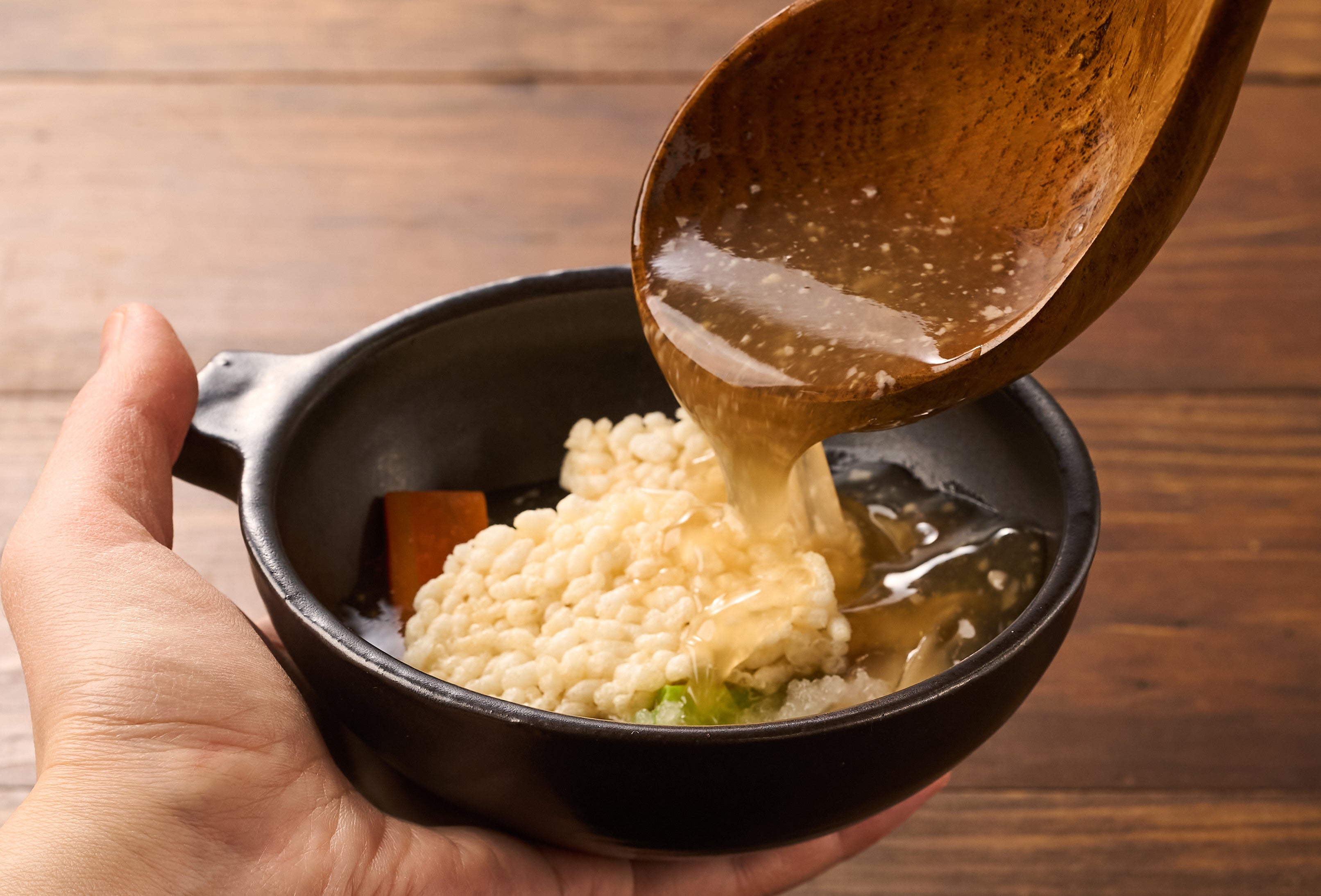 概要:新潟・松之山温泉発祥の「棚田鍋」を、ご家庭でも楽しめる、冬らしい味わいの鍋Kitで再現しました。とろみのあるお出汁に、雪をイメージした大根おろしを浮かべた一品で、体の芯から温めてくれます。煮込むほどにもっちりと、お出汁をかければサクサクとした食感を楽しめるおこげもお楽しみください。新潟の発酵調味料「かんずり」を加えることで、味の変化もお楽しみいただけます。