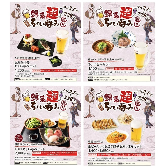 株式会社錦糸町ステーションビル(以下「錦糸町テルミナ」)、双日商業開発株式会社(以下「オリナス錦糸町」)、株式会社東京楽天地(以下「楽天地ビル、アルカイーストB1F」)、株式会社パルコ(以下「錦糸町 PARCO」)、三井不動産商業マネジメント株式会社(以下「アルカキット錦糸町」)の5社において、錦糸町への来街機会及び街の活性化、賑わいの醸成を目的に、2026年2月1日(日)~2月28日(土)の期間、対象の6施設計54飲食店にて「錦糸超 ちょい呑み巡り」イベントを開催いたします。