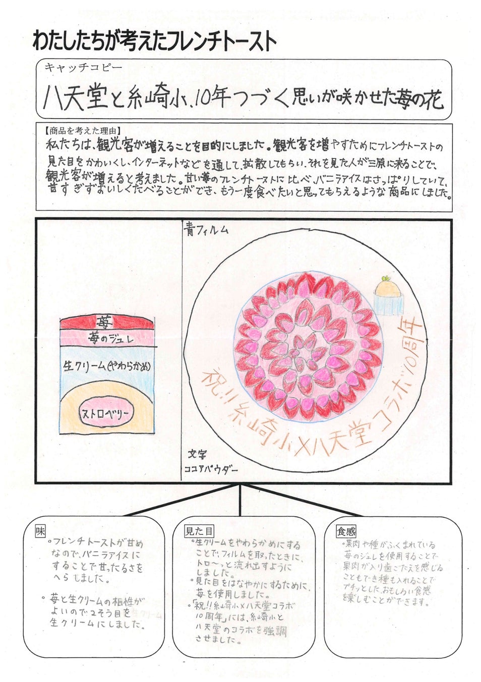 地元に親しまれるメニューをテーマに、今回児童8チームでプレゼン大会を行い、『八天堂と糸崎小、10年つづく思いが咲かせた苺の花』がグランプリ、『大人も子供も楽しめる三原だるまフレンチトースト』が準グランプリに選ばれました。