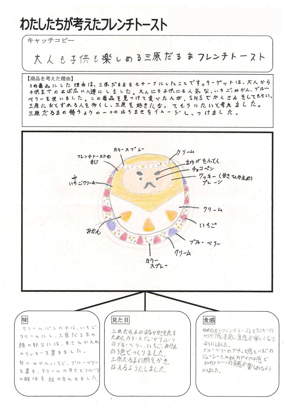 地元の皆様に親しまれるメニューをテーマに、児童(5、6年生56名)にアイデアを考案いただきました。児童8チームによるコンセプトや見た目、味わいに関するプレゼン大会を経て、数ある素敵なアイデアの中から『苺のフレンチトースト』『三原だるまフレンチトースト』の2品が決定しました。