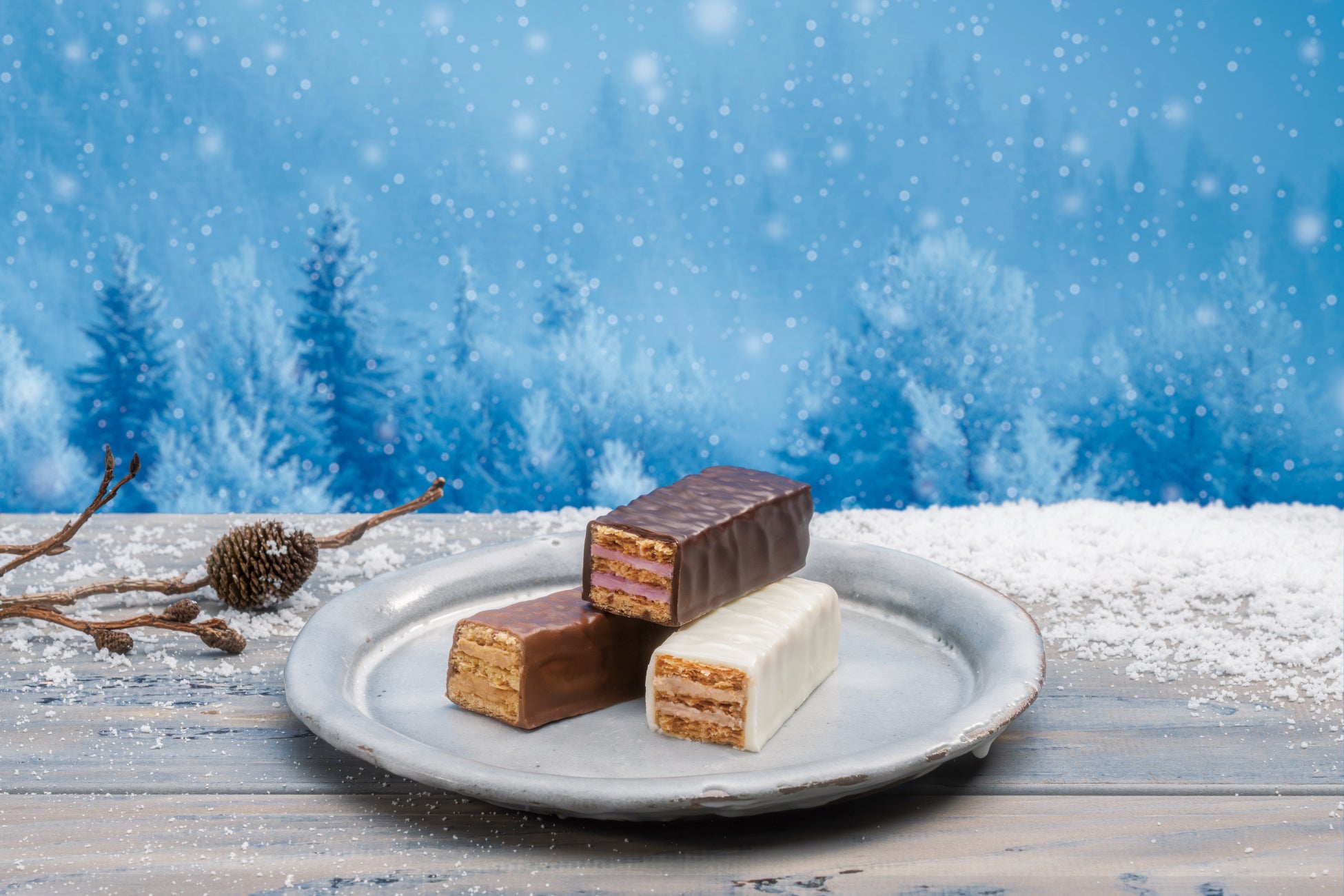 パッケージは、北海道の美しい冬景色を描く「美冬」のブランドデザインを継承しつつ、空の色にはベリーの果実味や春を感じさせる温かなピンク色のグラデーションを施しました。また、ホワイトチョコレートでコーティングされた美冬を「レアチーズケーキ」に見立て、3種のベリー、そしてチーズを添えることで、甘酸っぱいハーモニーを表現しました。