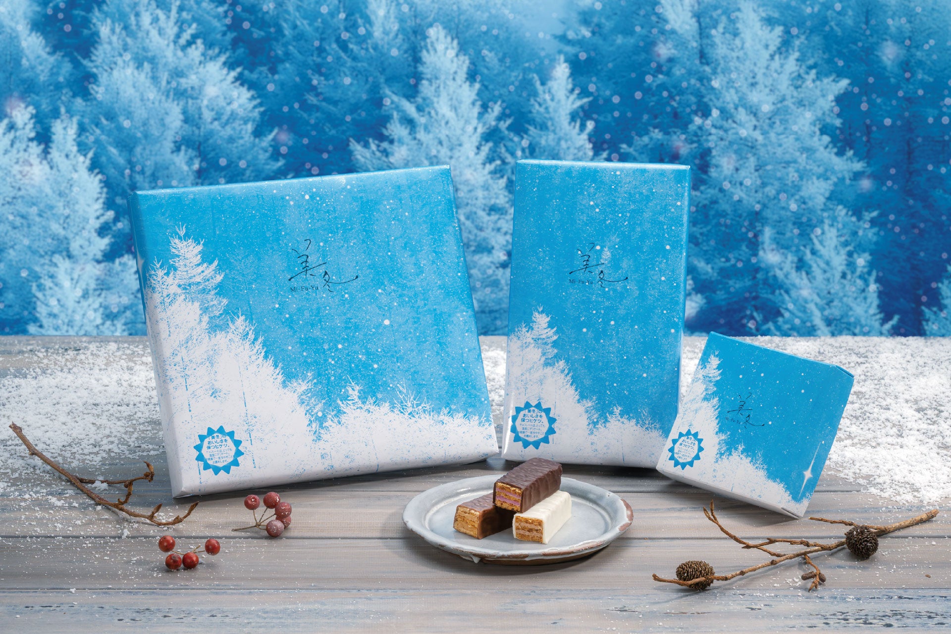 パッケージは、北海道の美しい冬景色を描く「美冬」のブランドデザインを継承しつつ、空の色にはベリーの果実味や春を感じさせる温かなピンク色のグラデーションを施しました。また、ホワイトチョコレートでコーティングされた美冬を「レアチーズケーキ」に見立て、3種のベリー、そしてチーズを添えることで、甘酸っぱいハーモニーを表現しました。