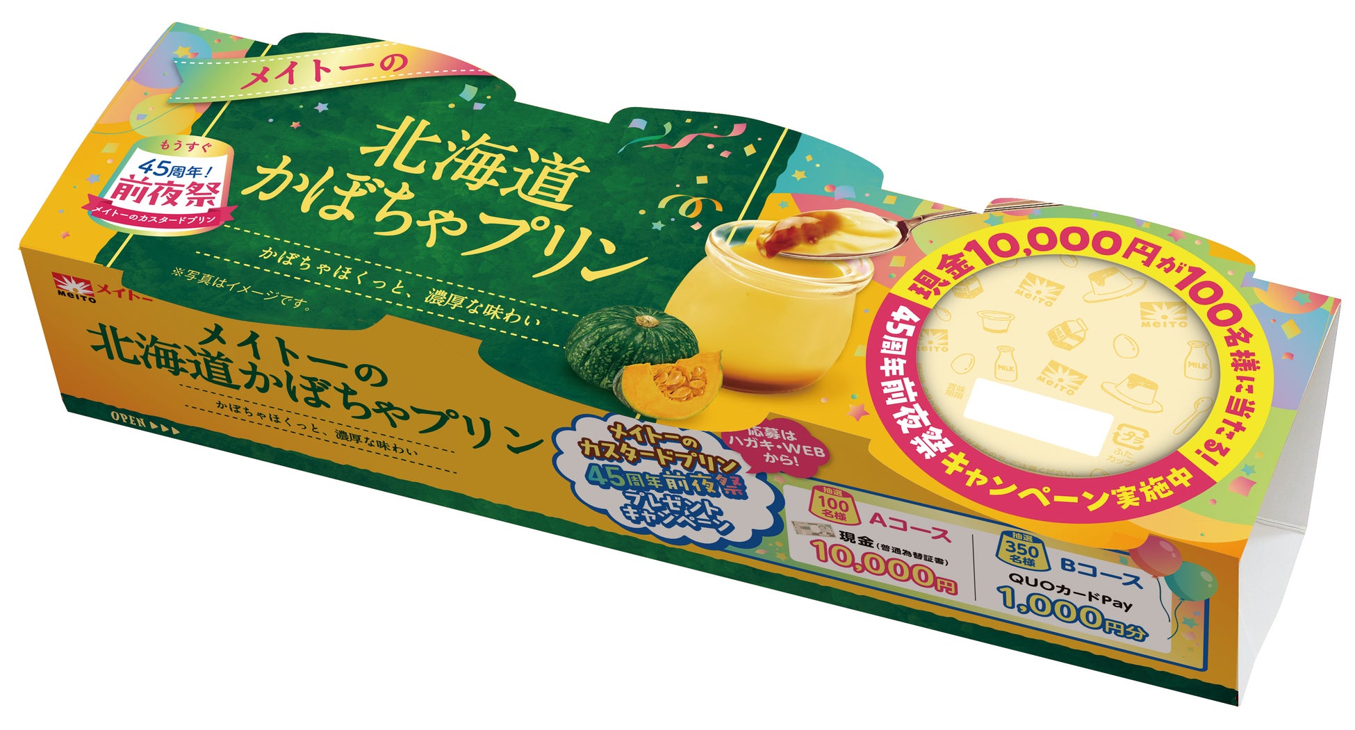 本キャンペーンは、「メイトーのカスタードプリン」をはじめとした対象商品を合計500円(税込)以上購入したレシートで、ハガキ貼付もしくはWebで応募していただくと、45周年にちなんで抽選で合計450名様に賞品が当たるキャンペーンです。抽選で100名様に現金1万円分、350名様にQUOカードPay1,000円分をプレゼントいたします。皆様からのご応募お待ちしています。