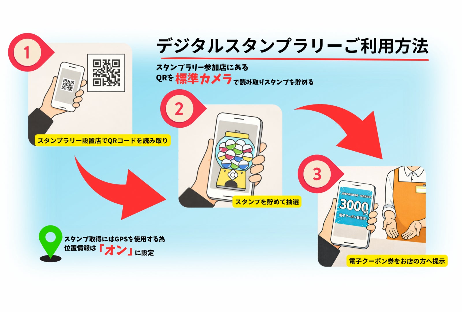 3スタンプ取得: 抽選で3,000円・2,000円・1,000円のクーポン券
