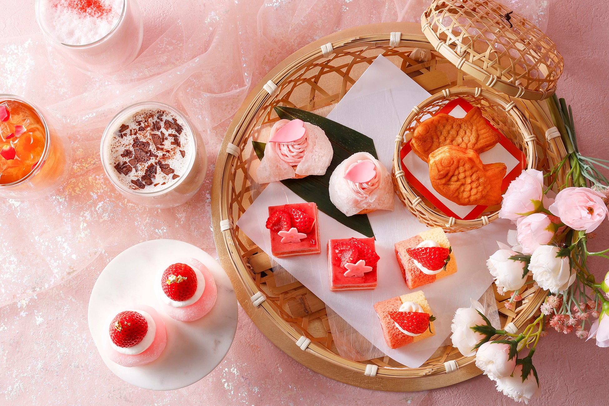 スイーツは、いちごを丸ごと一粒のせた淡いピンク色の大福や、桜のモチーフをあしらった上品なケーキ、甘酸っぱいいちごの風味が広がるロールケーキが彩ります。竹籠に収められているのは、ミニサイズの可愛らしい鯛焼き。さらに、雛人形のような着物を羽織った佇まいのいちごモンブラン仕立てのシュークリームは、中にいちごを一粒忍ばせた贅沢な一品です。ドリンクは、あたたかく濃厚な味わいのほうじ茶ショコララテと、淡いピンク色が可愛い桜&ストロベリーラテ、華やかなローズ香るダージリンクーラーの3種類をご用意し、お好みのものを一つお選びいただけます。