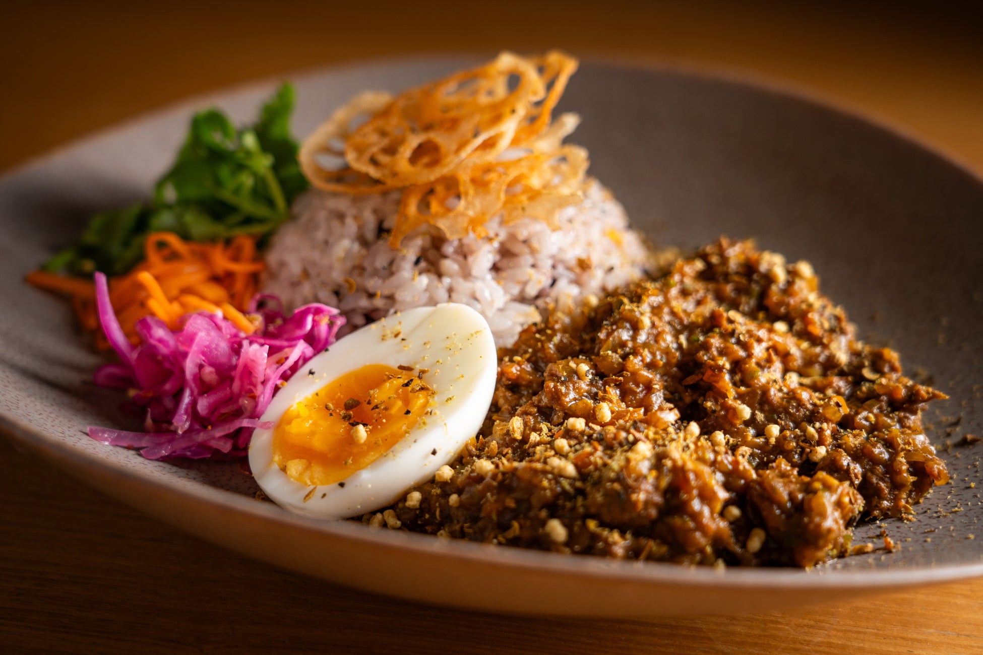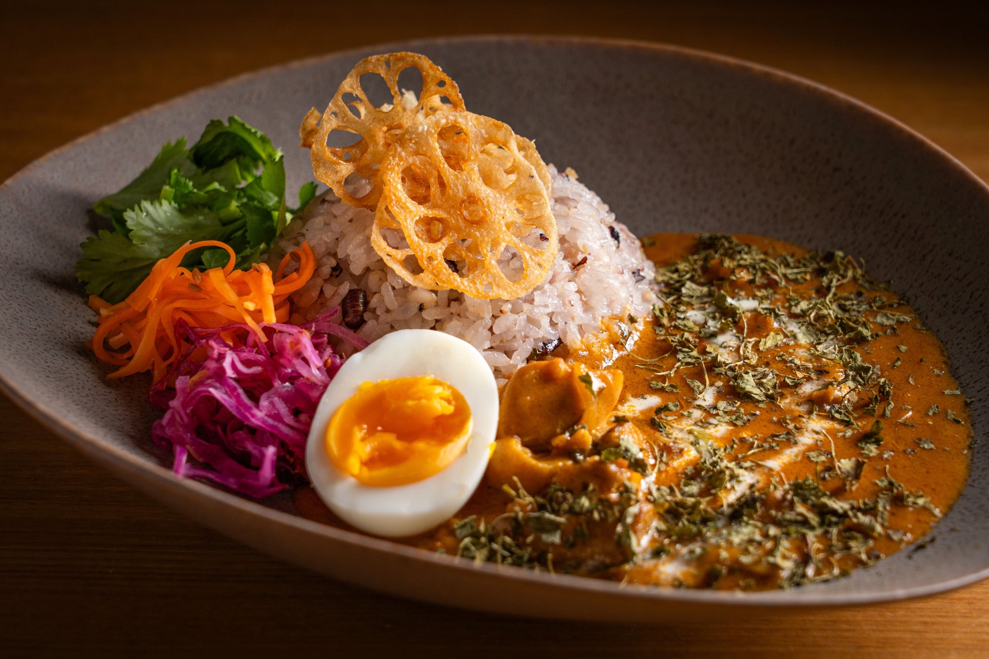 紫キャベツのピクルスやキャロットラペなど彩り豊かな副菜と、カリッとしたフライドレンコンをアクセントに滋味あふれる味わいをご堪能ください。