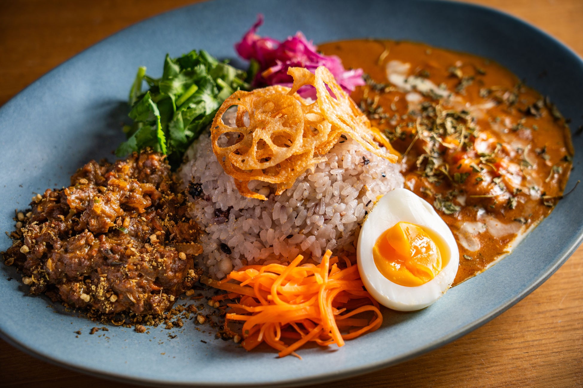 「祖谷の鹿肉キーマ」と「阿波尾鶏のバターチキン」。徳島の豊かな自然が育んだ二つの主役を一度に楽しめる、贅沢なあいがけスタイルでご用意。