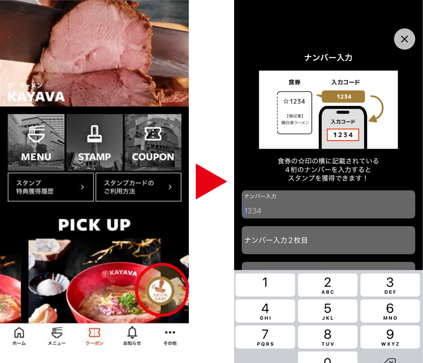 店舗へご来店時に、食券に記載されているナンバーをKAYAVA.公式アプリに入力して抽選にチャレンジいただくと、期間中は来店ごとに必ず5スタンプが当たります。30マス達成まであともう少しの方も、これから始められる方も、6回参加すると合計30スタンプが貯まり、対象ラーメンが500円引きになるクーポンをプレゼントいたします。
