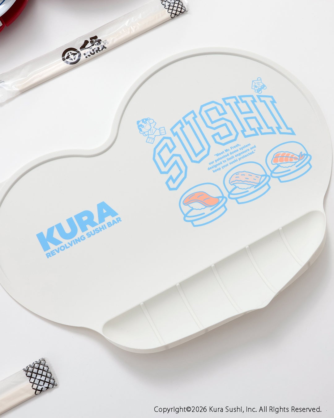 むてん丸・くら吉・抗菌寿司カバー「鮮度くん」に入ったお寿司のイラストをあしらい、毎日の食事時間を楽しく彩ります。