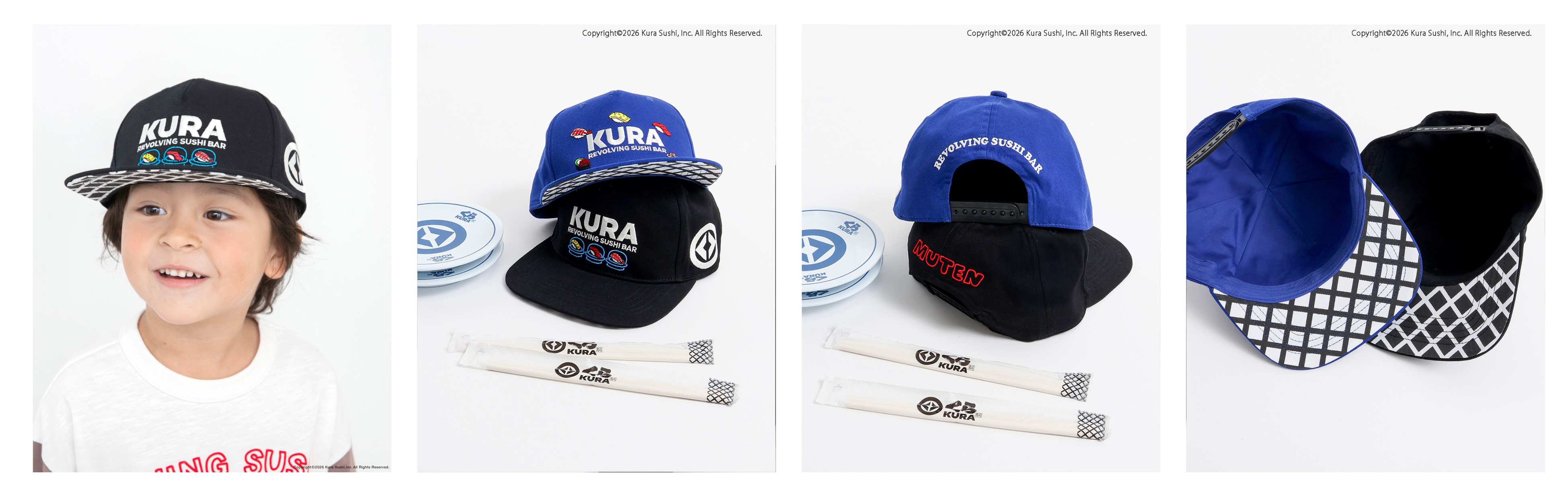 ベージュはむてん丸×くらら、ブラックはネオンカラーのお寿司柄、ブルーは「KURA」の手書き風ダイヤチェッカーデザイン。