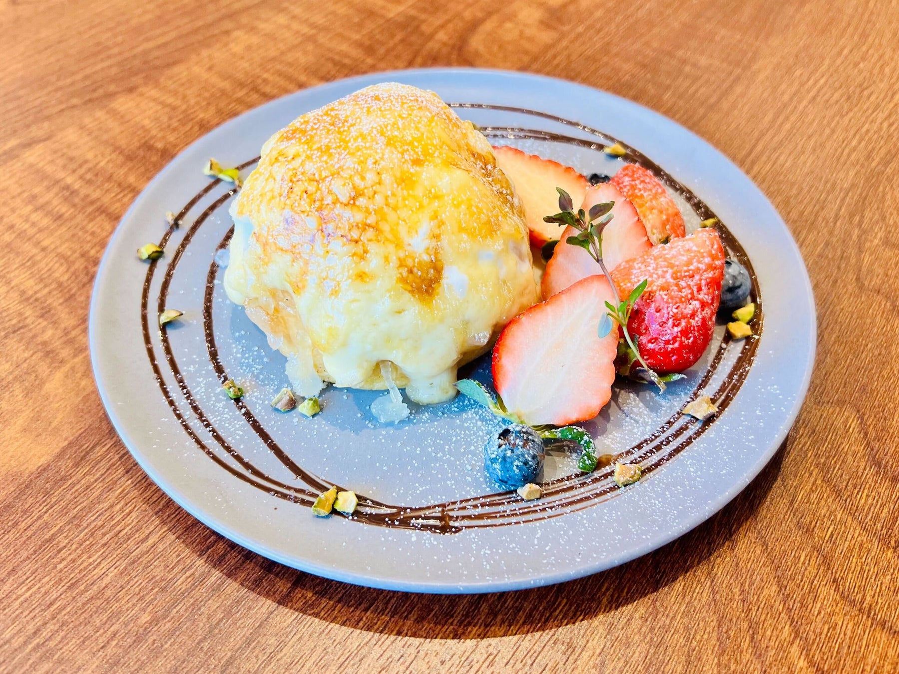 ご注文を受けてから焼き上げるぱんケーキに、甘酸っぱいいちごとチョコレートクリームをトッピングしました。