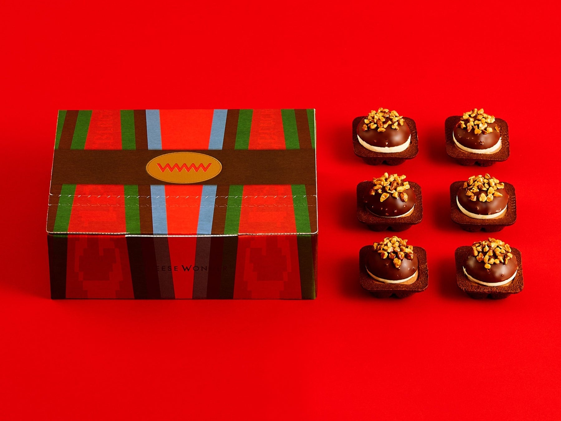 CHEESE WONDER GIANT BLACKは、濃厚でふわりとした生ガトーショコラと、なめらかな生チーズムースが調和した、ショコラナッツ生チーズケーキ。チョコレートとナッツを纏わせることで、CHEESE WONDERならではの“生”のくちどけに、より奥行きのある味わいと食感を加えました。生ガトーショコラと生チーズケーキ、2つの魅力が融合した、冬限定の特別な一品です。チョコレートを加えて香り高く仕上げたザクザクのプレスドアーモンドクッキーと、ふわとろのチーズムースが、心地よい食感の変化を生み出します。