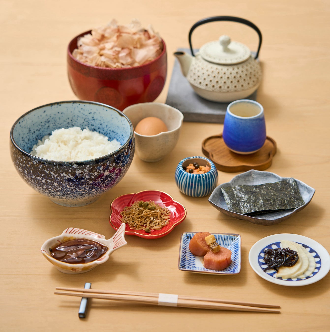 香りが最も立つ瞬間に提供される鰹節とともに、日本全国から厳選したご飯のお供や旬の食材を組み合わせることで、素材そのものの旨味を引き立てる、シンプルで上質な一皿を提供しています。