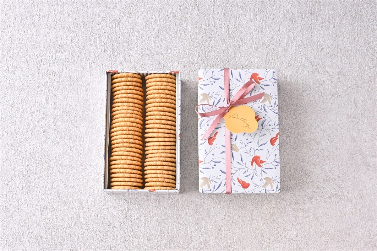 2月1日(日)にButtery本店とオンラインショップで新発売となるのは、小鳥の舞う上品なデザイン缶に、たっぷりのクッキーを詰めた「Butteryフラワークッキー缶」です。店内の工房で丁寧に焼き上げた軽やかなクッキーは、バターの香りとコクがありながらもすっきりとしたやさしい甘さ。サクサクとした食感と、何枚でも食べられる約3.5cmのサイズも魅力。華やかなピンクのリボンに包まれたクッキー缶は、大切な方へのギフトにもおすすめです。