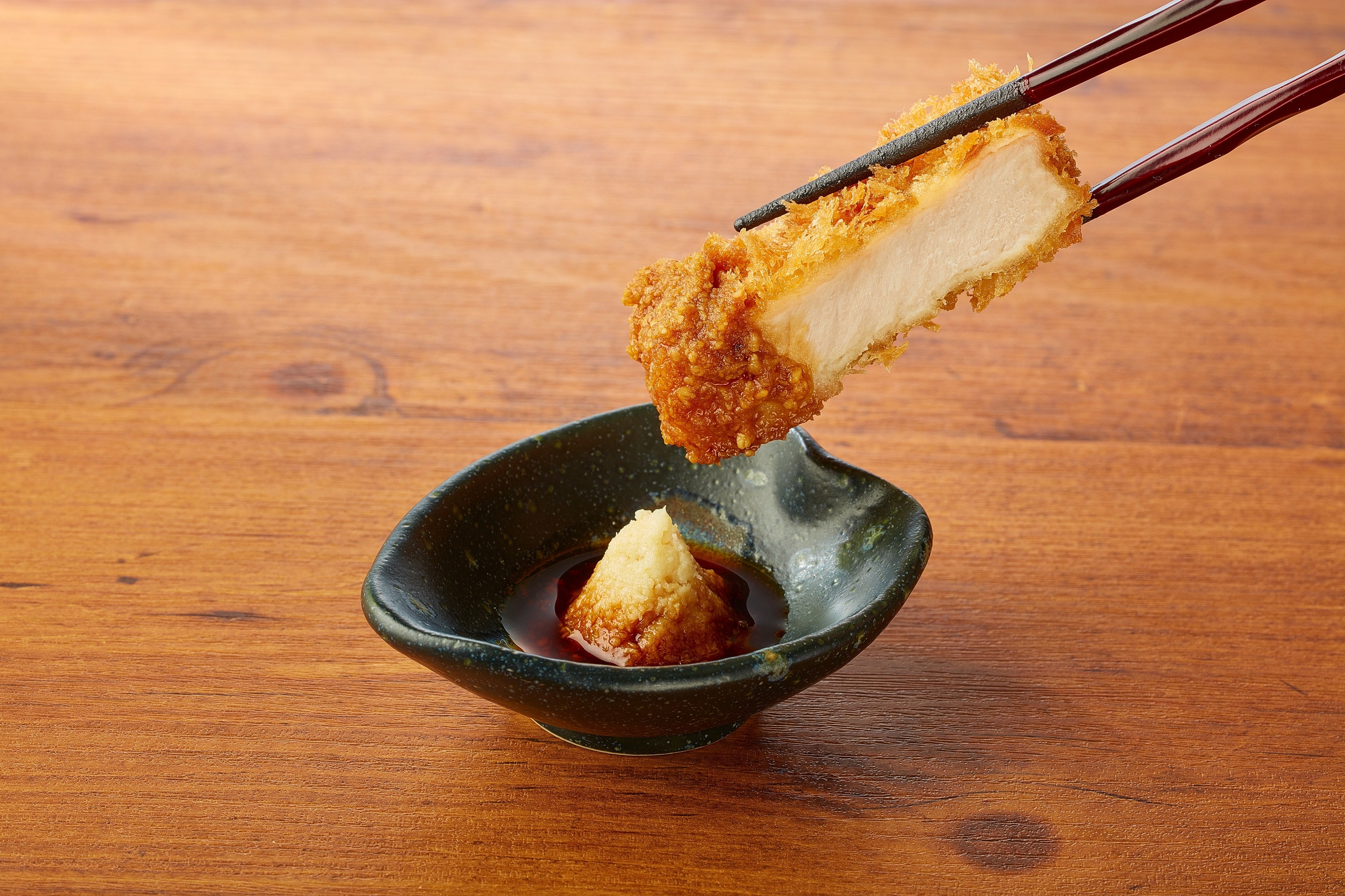 さぼてんでは、自慢のかつをよりおいしく召し上がっていただくため、「食べ方提案」を行っています。 「北海道 熟成 ごまんてんロースかつ御膳」では、北海道産山わさびと醤油がセットになっており、山わさびを醤油に溶き、ロースかつに付ける“食べ方”をおすすめしています。