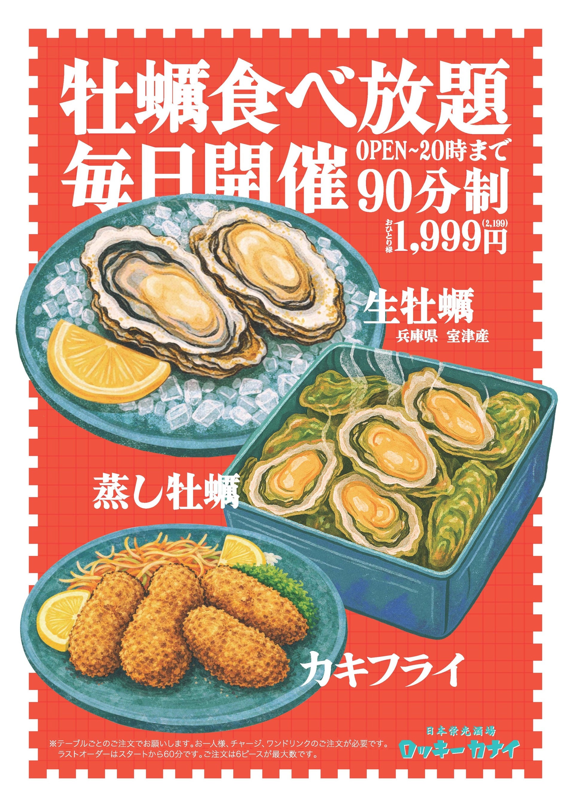 【期間限定ほぼ毎日・終日牡蠣放題】ロッキーカナイ 浅草 兵庫県産 室津牡蠣90分食べ放題 1,999円(税込2,199円)