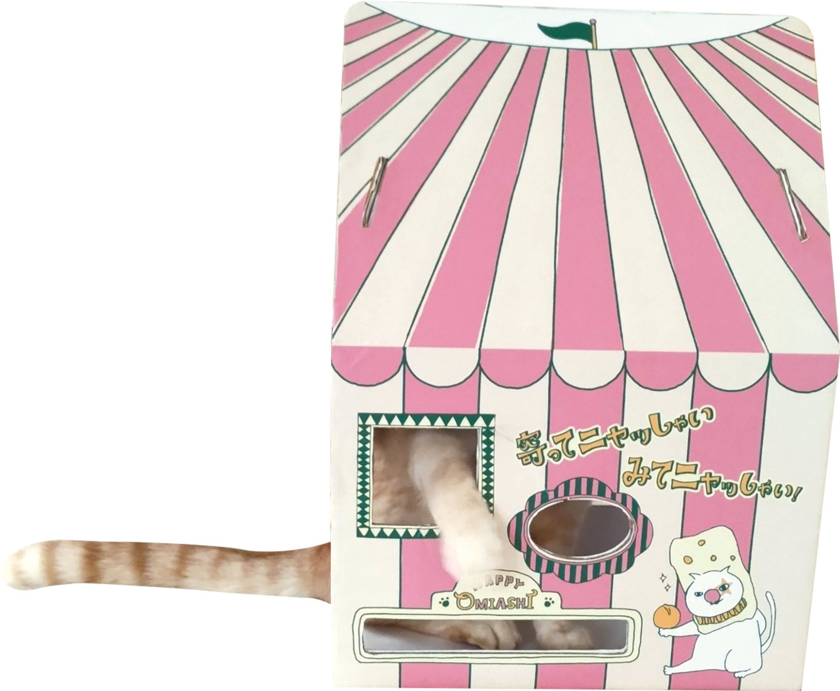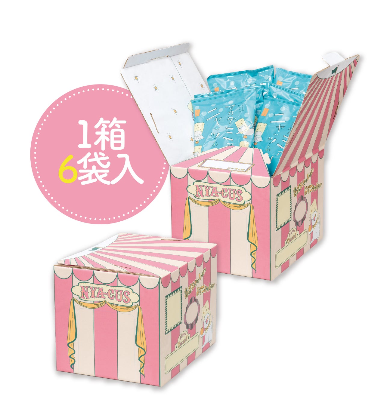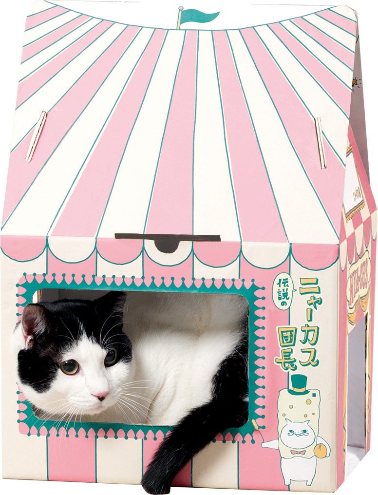 ネコ好き社員が細部にまでこだわって考案した『マカダミアニャッツBOX』は、組み立てると、幅25センチ、高さ44センチのかわいいサーカステントになります。大き目サイズのネコでも出入りしやすいゆったりサイズの出入口、手足を出して遊べるたくさんの小窓、大好きな家族の様子もしっかり見える見晴らしのいい大きな窓など、楽しい仕掛けが満載です。楽しく遊ぶわが(ネ)コを愛でながら、「マカダミアナッツおかき」を食べれば、おなかもこころも満たされること間違いなしです。