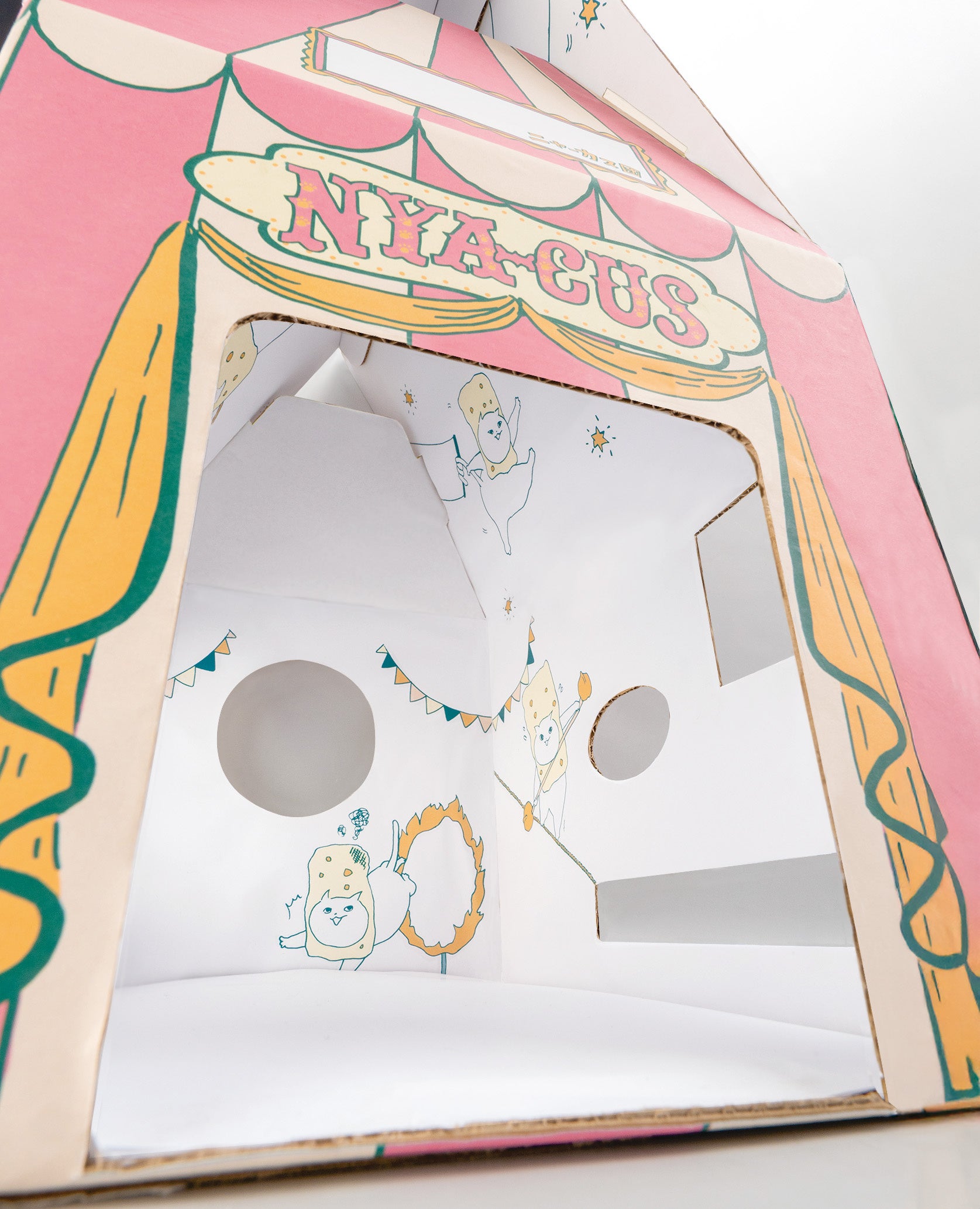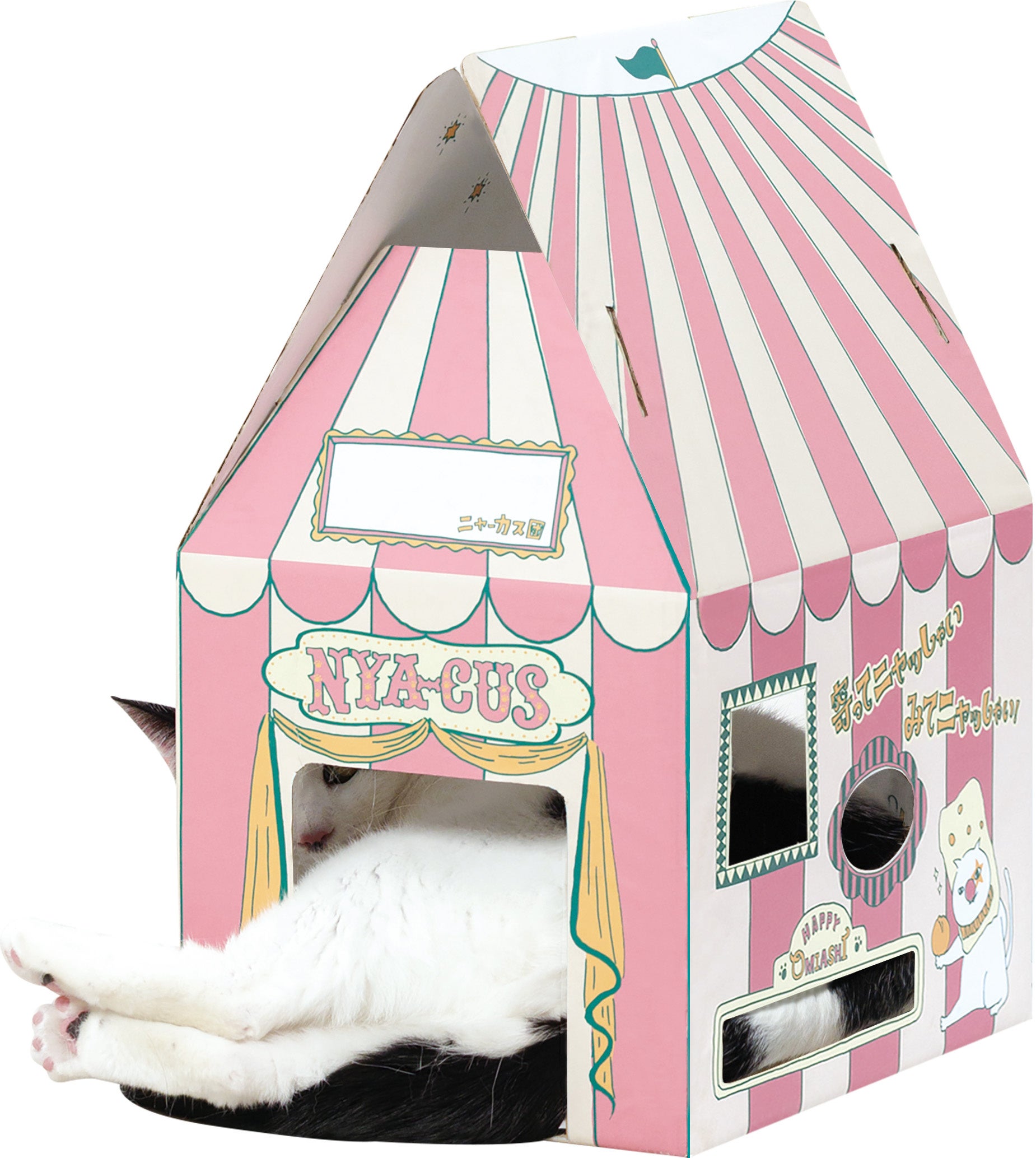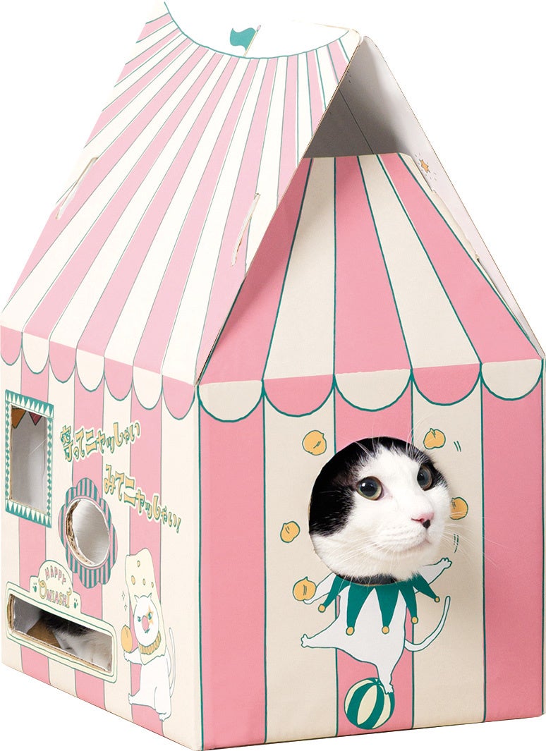 ネコ好き社員が細部にまでこだわって考案した『マカダミアニャッツBOX』は、組み立てると、幅25センチ、高さ44センチのかわいいサーカステントになります。大き目サイズのネコでも出入りしやすいゆったりサイズの出入口、手足を出して遊べるたくさんの小窓、大好きな家族の様子もしっかり見える見晴らしのいい大きな窓など、楽しい仕掛けが満載です。楽しく遊ぶわが(ネ)コを愛でながら、「マカダミアナッツおかき」を食べれば、おなかもこころも満たされること間違いなしです。