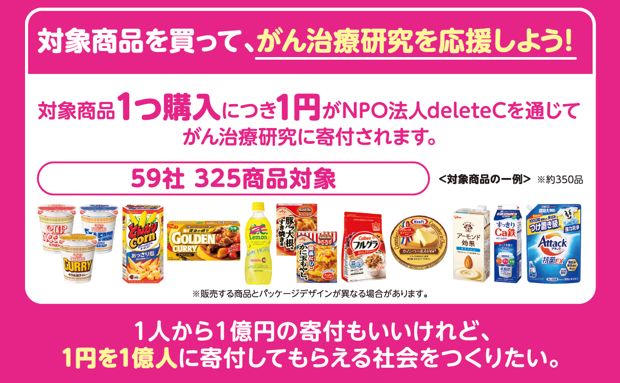 寄付対象商品には、59社・325商品が協力し、期間中は対象商品を購入すると1円の寄付ががん治療研究に寄付されます。期間中にあつまった想いと寄付は、deleteCの医療公募・選考会を経た医師・研究者にお届けします。