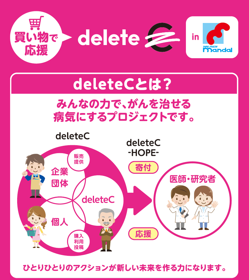 「deleteC」は、ふだんの暮らしの中でがん治療研究を応援できる、気軽な社会貢献活動です。