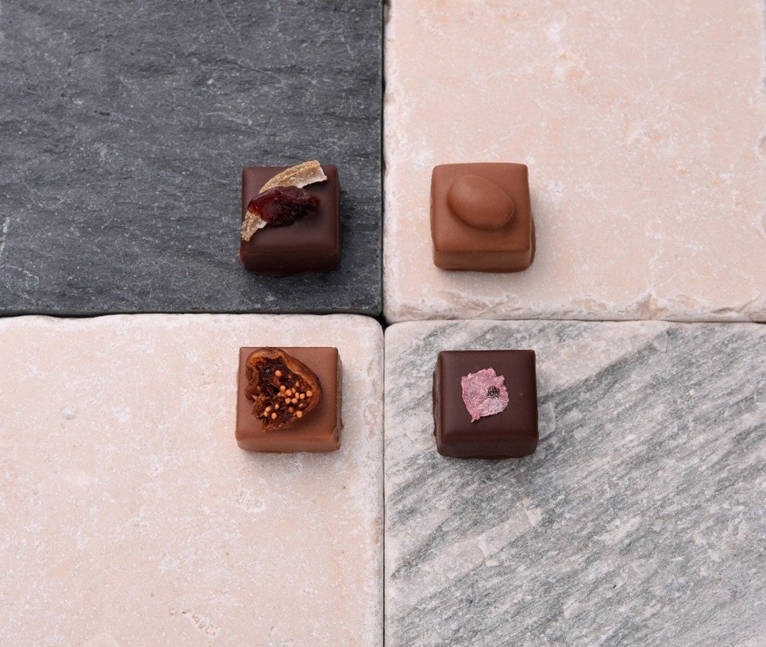 つくられたショコラは、地元の人々に広く愛されています。果実感あふれるパート・ド・フリュイやコンフィ、キャラメリゼしたナッツの香ばしさ、バターのコクが広がるキャラメル、軽やかな食感のシリアル。それぞれの素材の魅力を引き立てるチョコレートで包み込み、一粒ごとに異なる味わいを楽しめる、宝石のようなショコラに仕上げています。