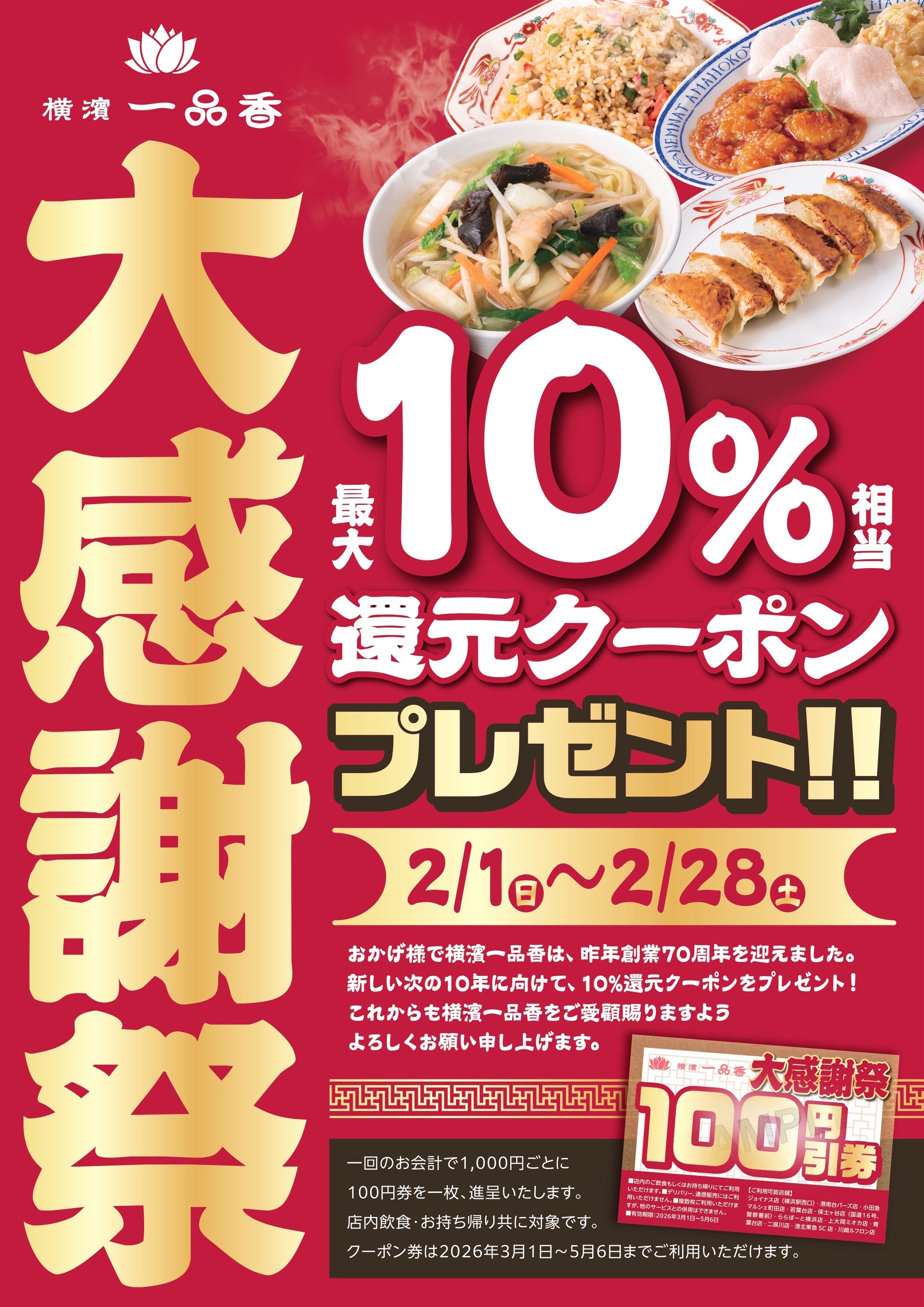 株式会社一品香(いっぴんこう、本社:神奈川県横浜市、代表取締役社長:鳥生恒平)が運営する横濱たんめん発祥の店「横濱一品香」は、1,000円(税込)の利用毎に100円のチケットを1枚プレゼントするキャンペーンを2月1日(日)より開催いたします。