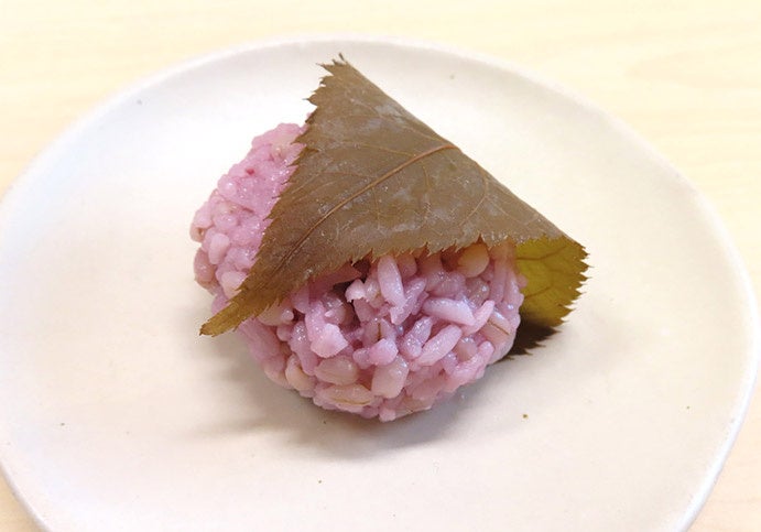 ② 国産桜葉がふわっと香り、かむほどにもち麦とあんの味わいが広がります。