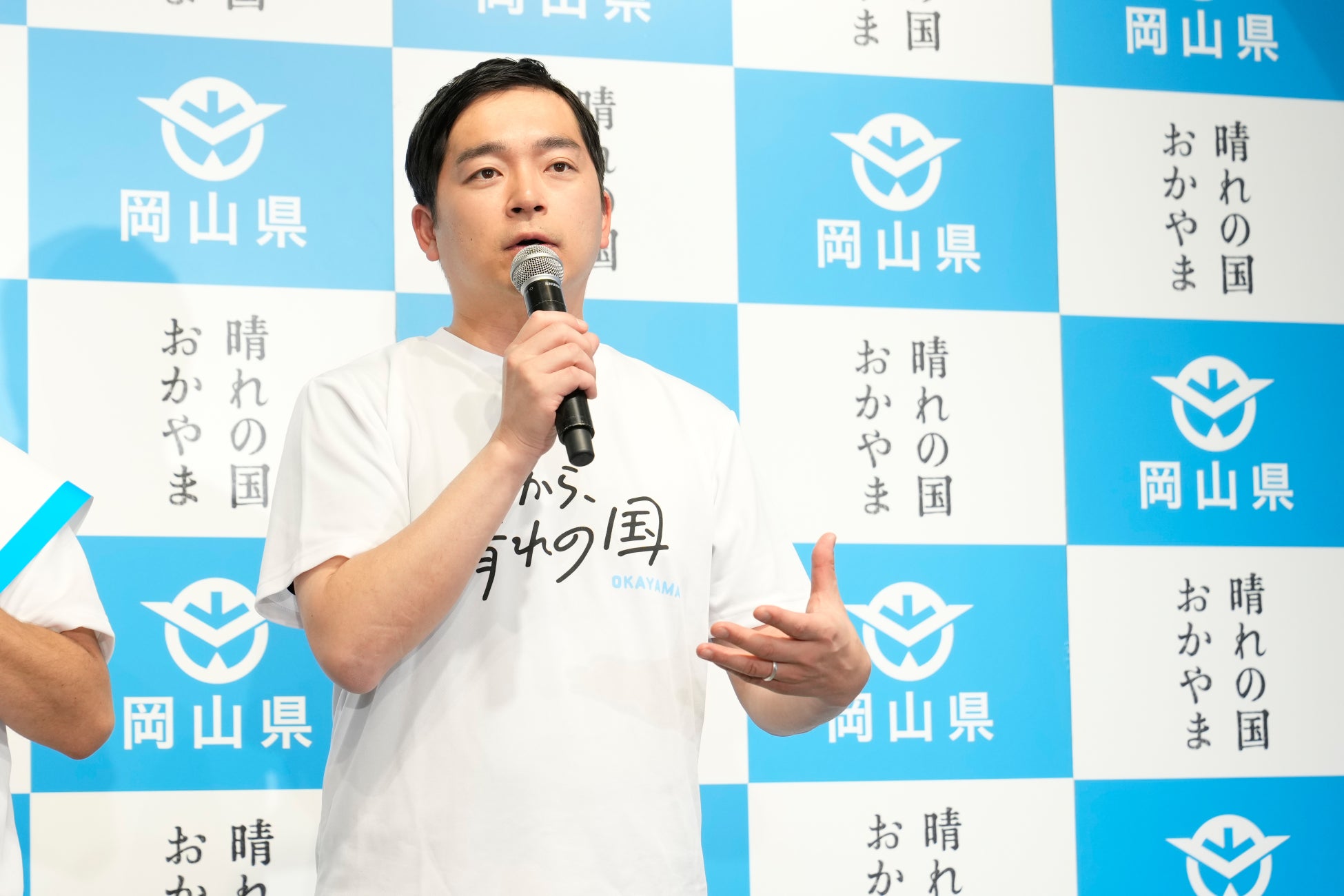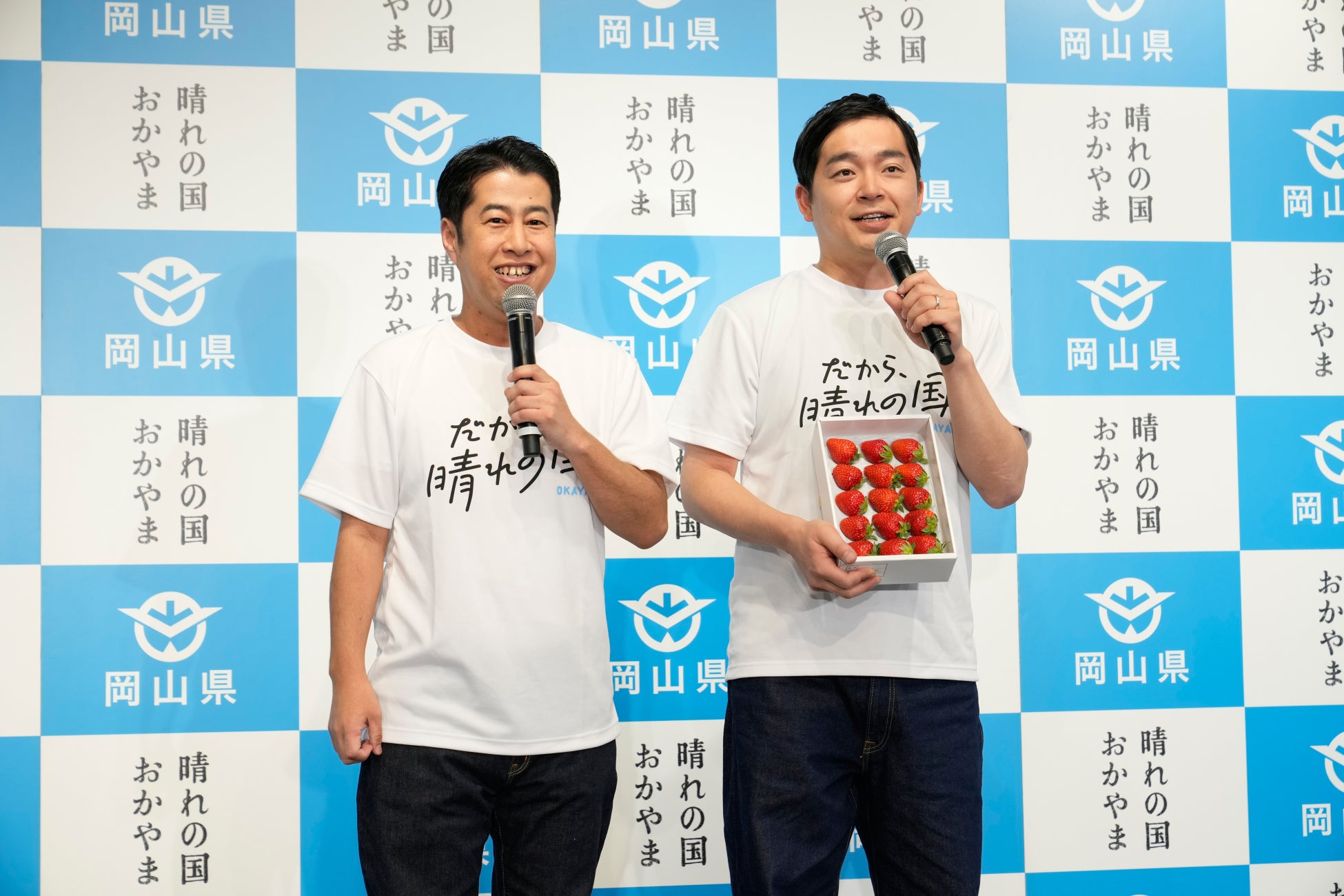 続いてステージには、岡山県出身のお笑い芸人であり、「M-1グランプリ 2022」のチャンピオンでもあるウエストランドが「だから、晴れの国」半袖Tシャツを着用して元気いっぱいに登場。