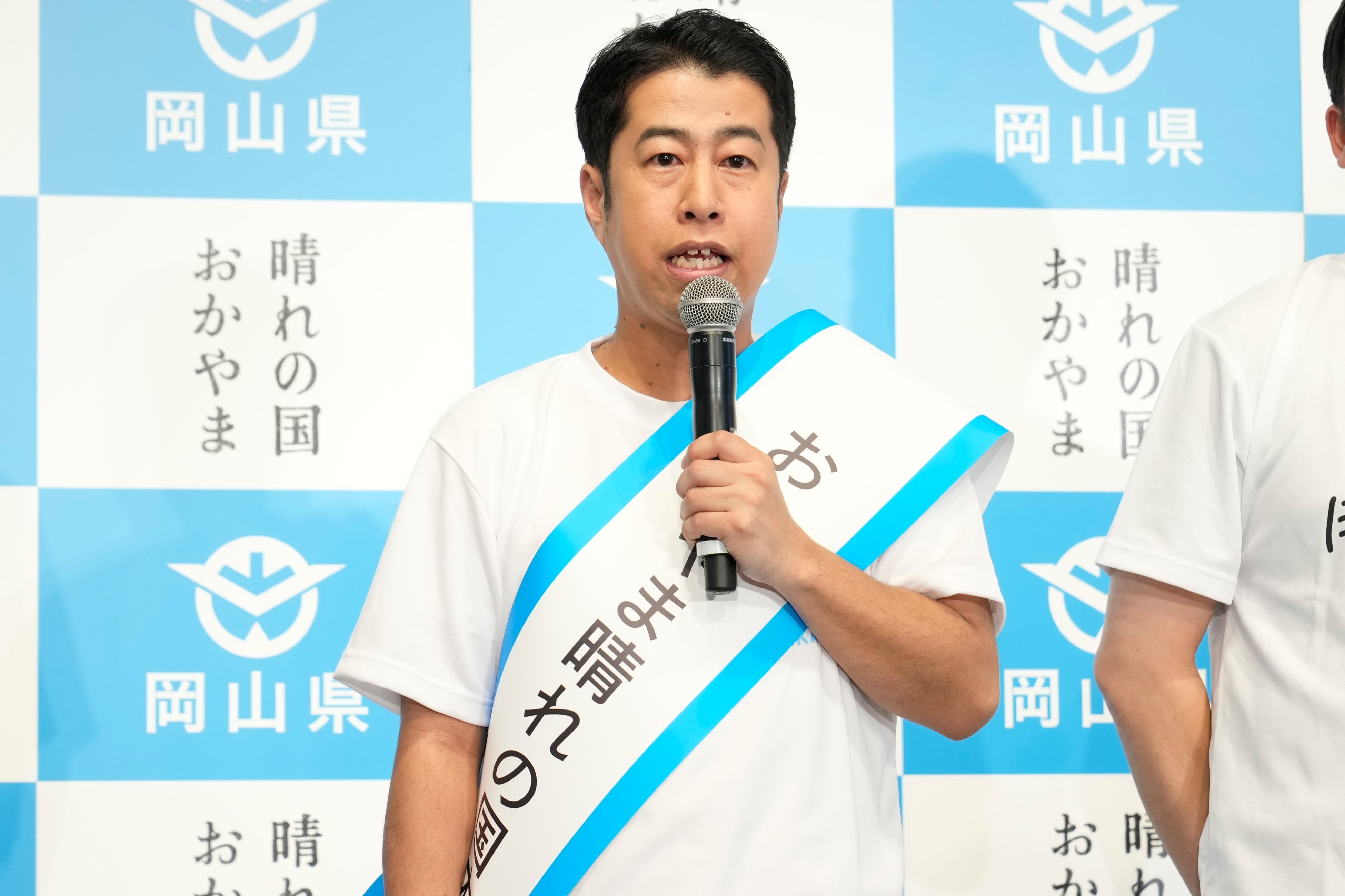 続いてステージには、岡山県出身のお笑い芸人であり、「M-1グランプリ 2022」のチャンピオンでもあるウエストランドが「だから、晴れの国」半袖Tシャツを着用して元気いっぱいに登場。