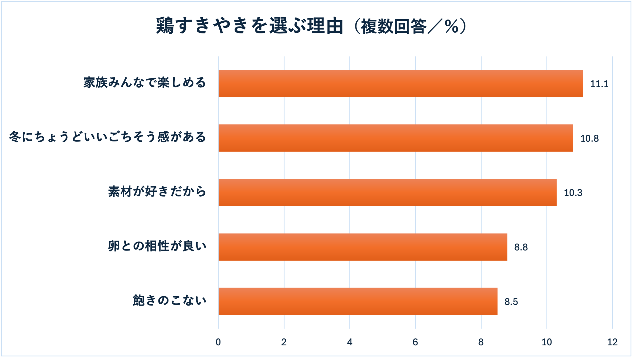 すき焼きといえば“牛肉”のイメージが強い一方で、今回の調査では「鶏すきやき鍋」を選ぶ層に顕著な特徴 が見られました。「鶏すきやき」を選んだ理由(複数回答)は、以下が上位に並びます。