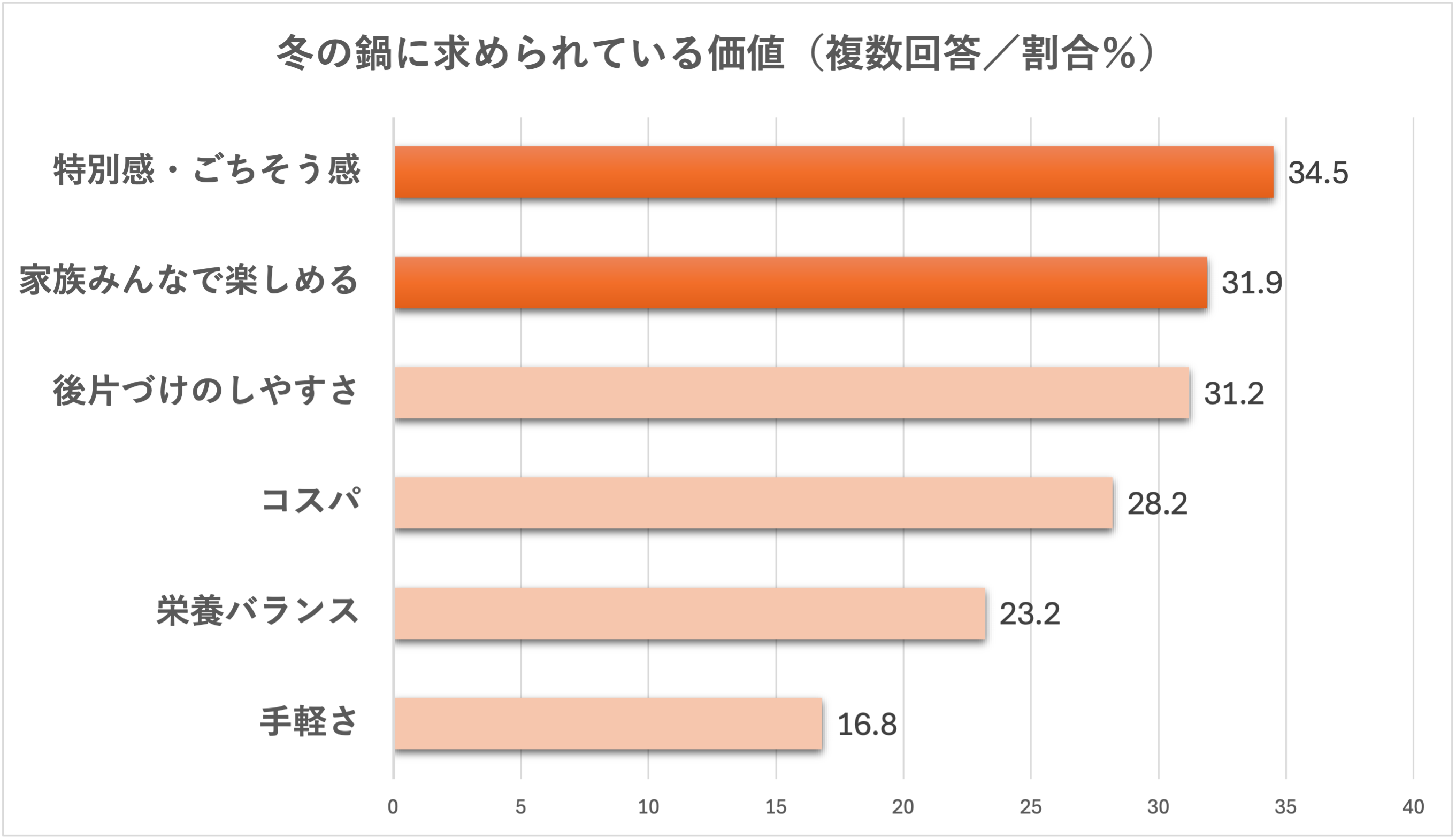 鍋に求める点は、「特別感・ごちそう感」(34.5%)、「家族みんなで楽しめること」(31.9%) が上位。コスパや手軽さよりも「家族と囲む特別な時間」を重視していることが特徴です。