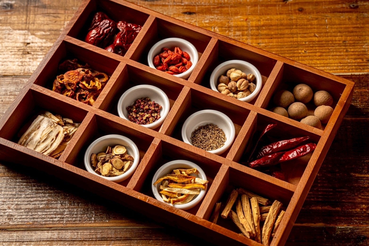 スープごとに異なる薬膳食材は、木箱に整然と仕分けされた状態でお持ちします。備え付けの解説シートと見比べながら効能を確認し、形や色、匂いを楽しんだ後に、お客様自身でスープに投入していただきます。