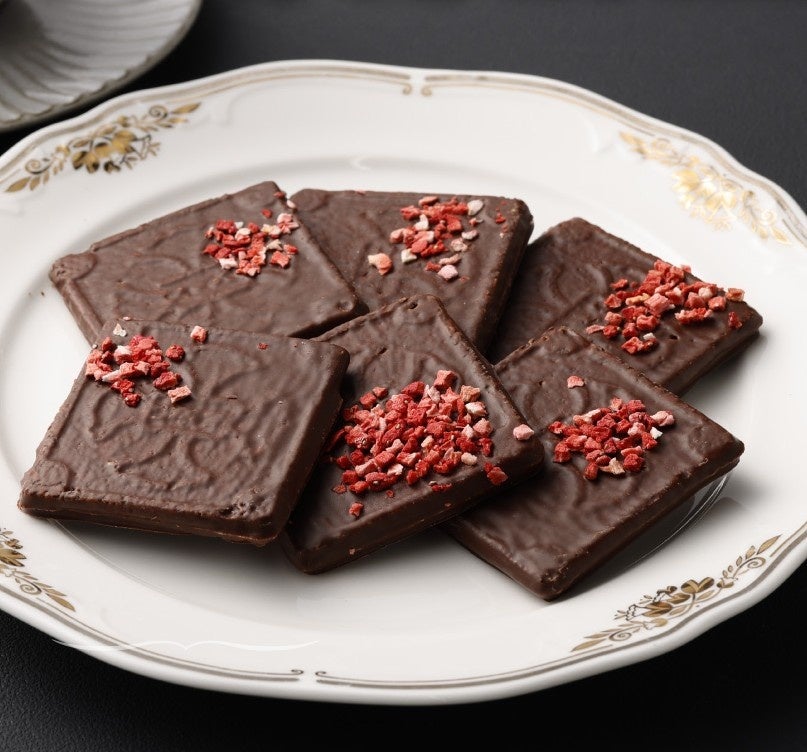 苺果汁を練り込んだ生地に、苺のフリーズドライ粉末を混ぜた特製チョコをサンド。さらに全体をクーベルチュールチョコレートでコーティングしました。長崎県産素材を大切に、生産者と共に歩んできた老舗だからこそ実現できた、期間限定の特別な味わいです。