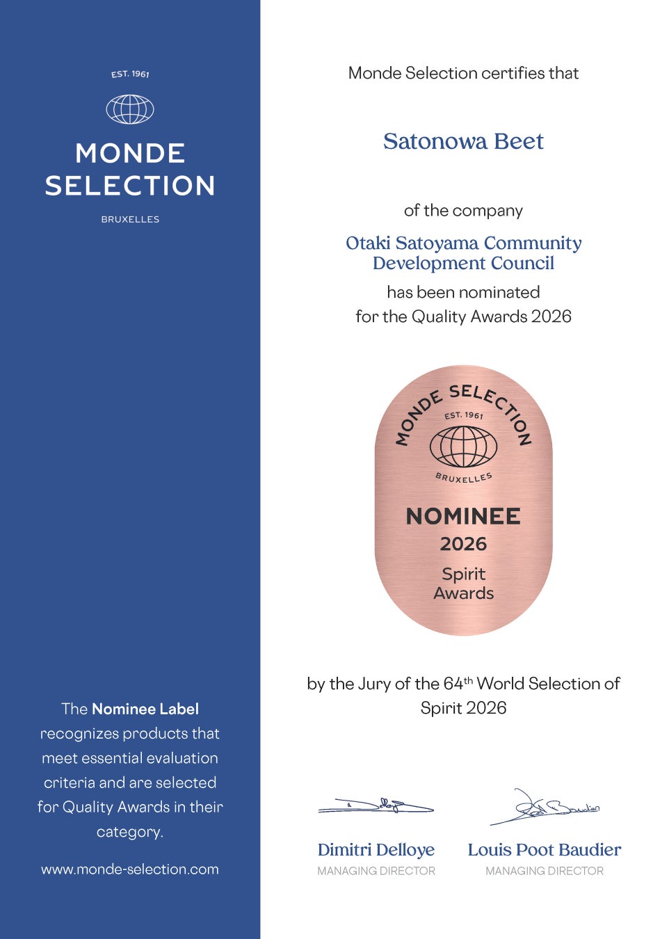 本ノミネートは、第64回 World Selection of Spirits 2026 の審査員団により、