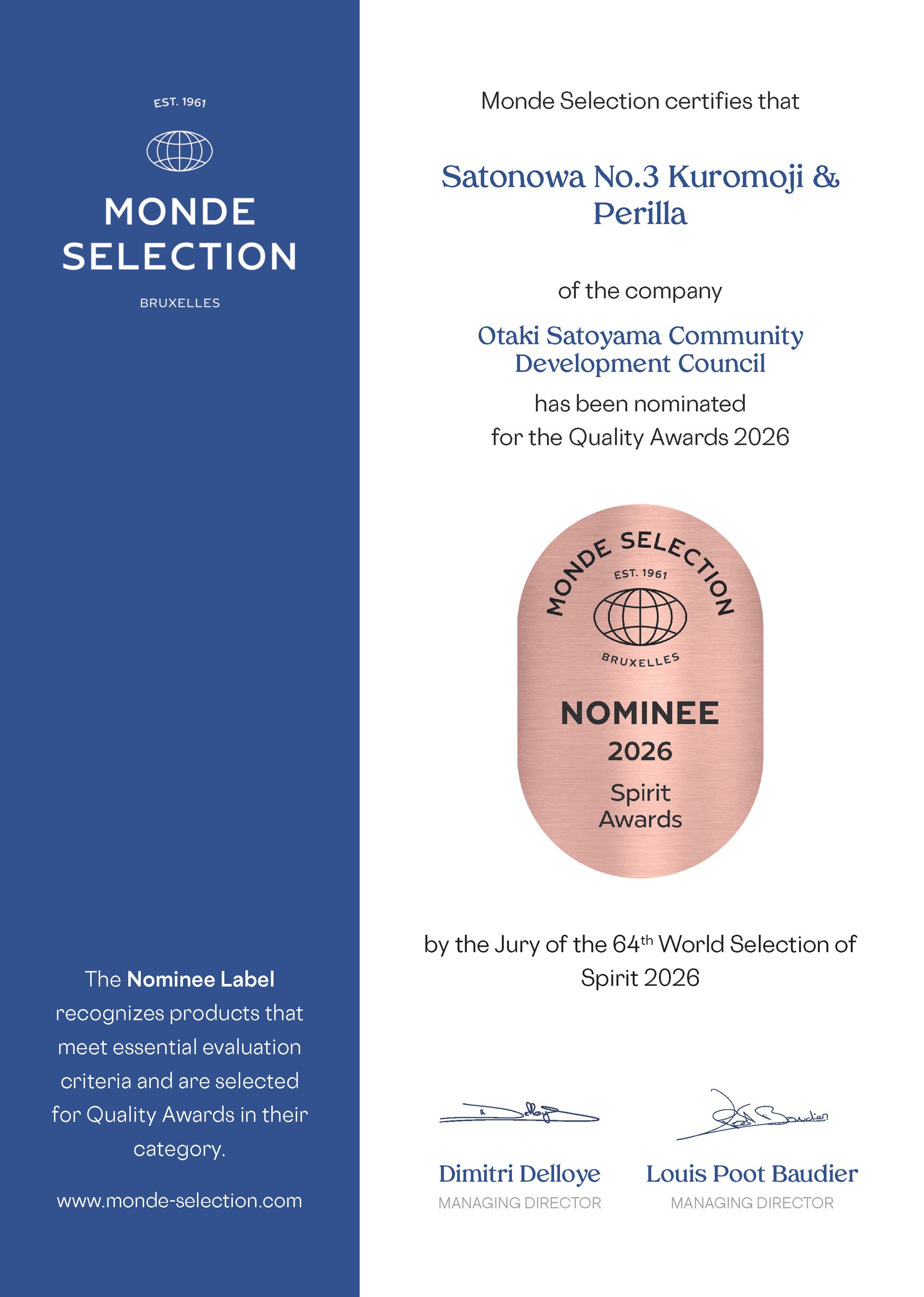 本ノミネートは、第64回 World Selection of Spirits 2026 の審査員団により、