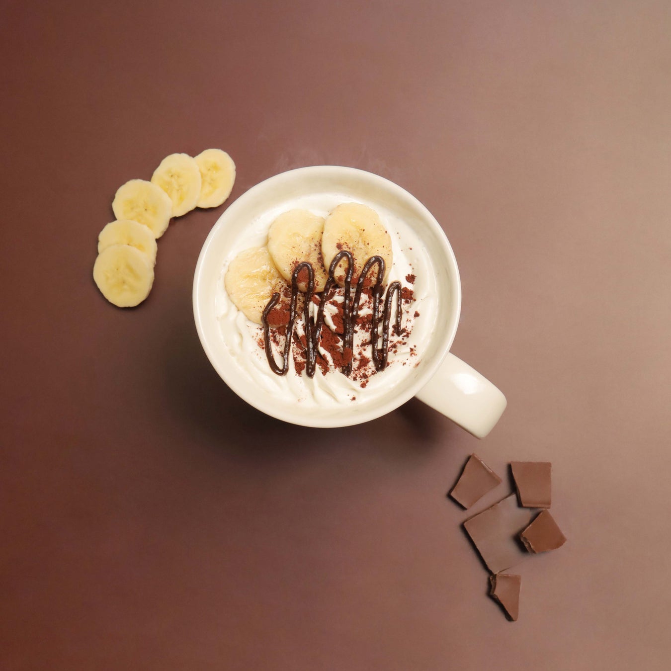 ココアとバナナを一緒にミックスし、バナナのとろっとしたなめらかさを楽しめる新感覚のホットココア。ソイミルクをベースに、バナナ本来の甘さを活かすため、甘味料は甜菜糖のみを使用しています。