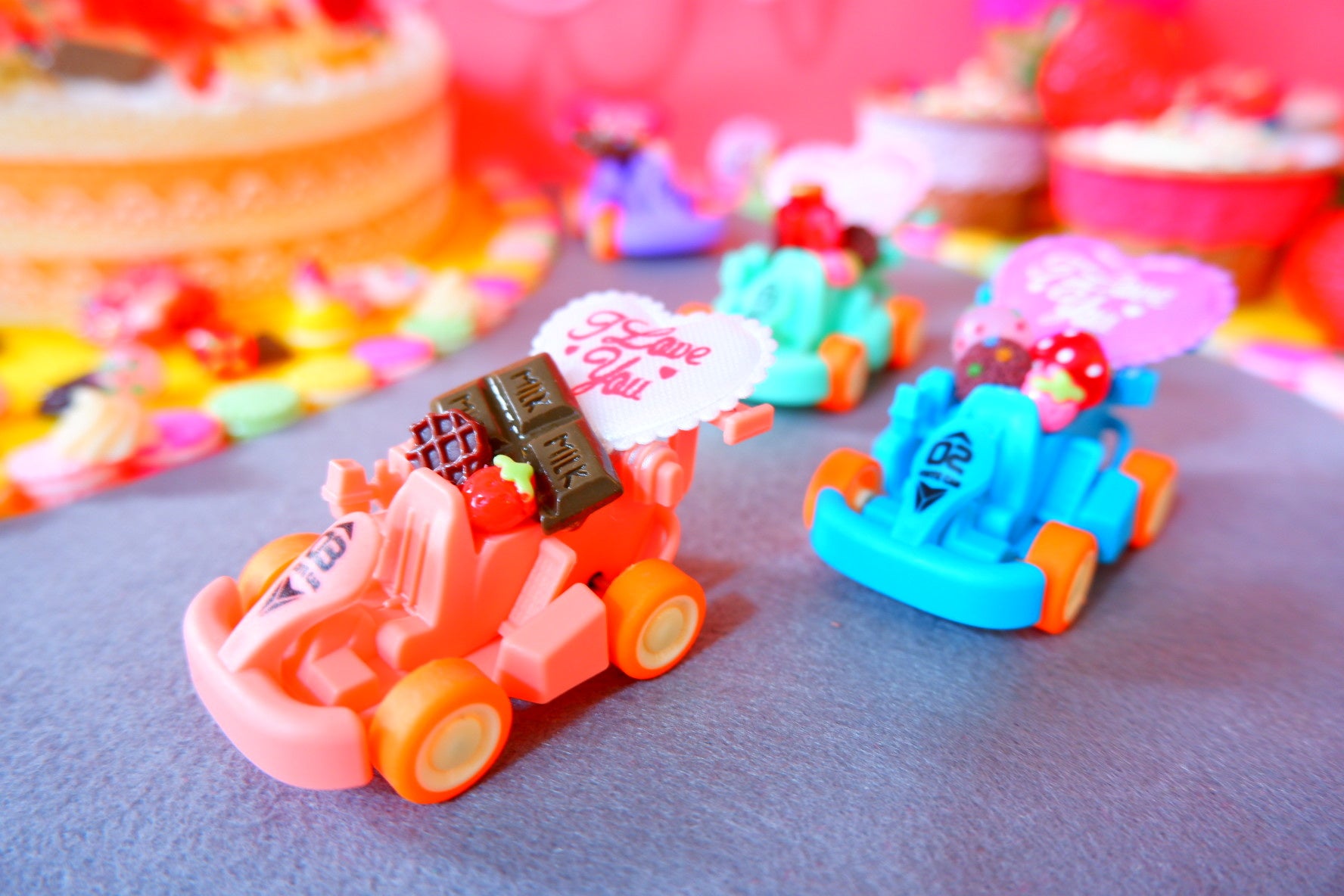 プルバックカーをチャームでかわいくデコレーション。走らせても、飾っても楽しいスイートなゴーカートです。