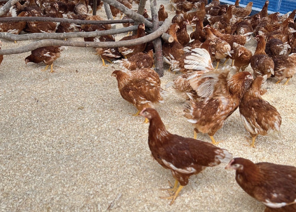 低密度の平飼いで健康的にのびのびと鶏舎内を走り回り約5%の割合で雄鶏を入れて自然に育てています。