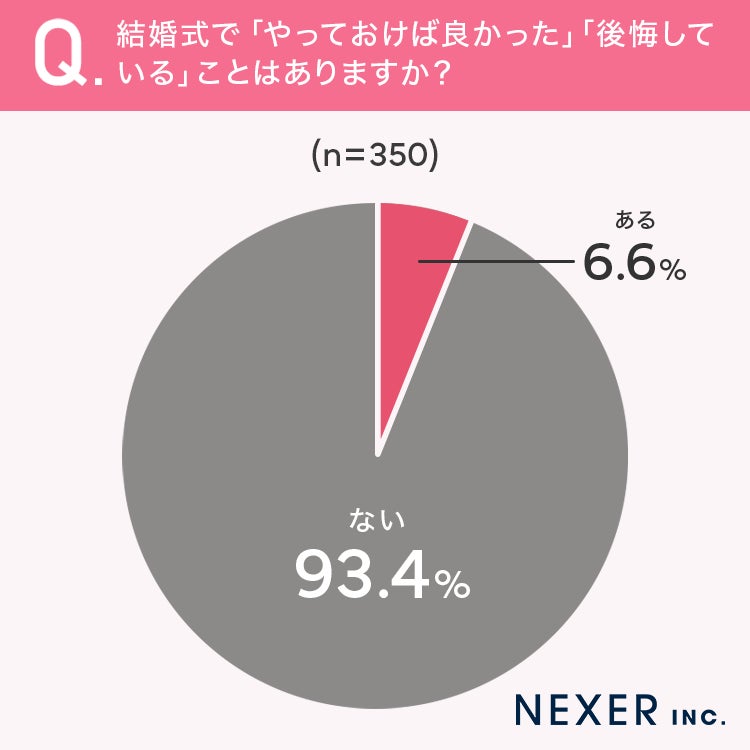 その結果「ある」と回答したのは6.6%、 「ない」と回答したのは93.4%となりました。9割以上の方が後悔していないと回答しており、多くの方が結婚式に満足していることがわかります。
