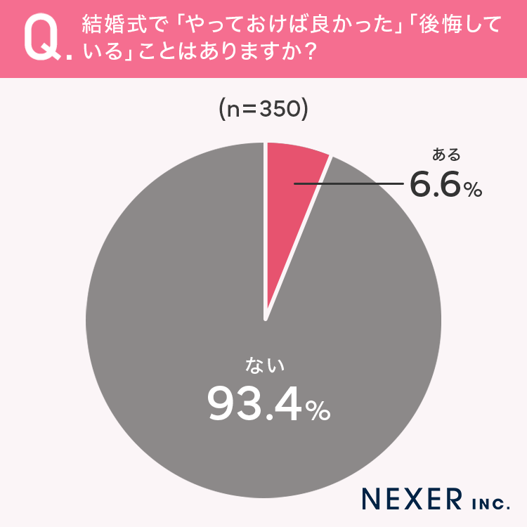 その結果「ある」と回答したのは6.6%、 「ない」と回答したのは93.4%となりました。9割以上の方が後悔していないと回答しており、多くの方が結婚式に満足していることがわかります。