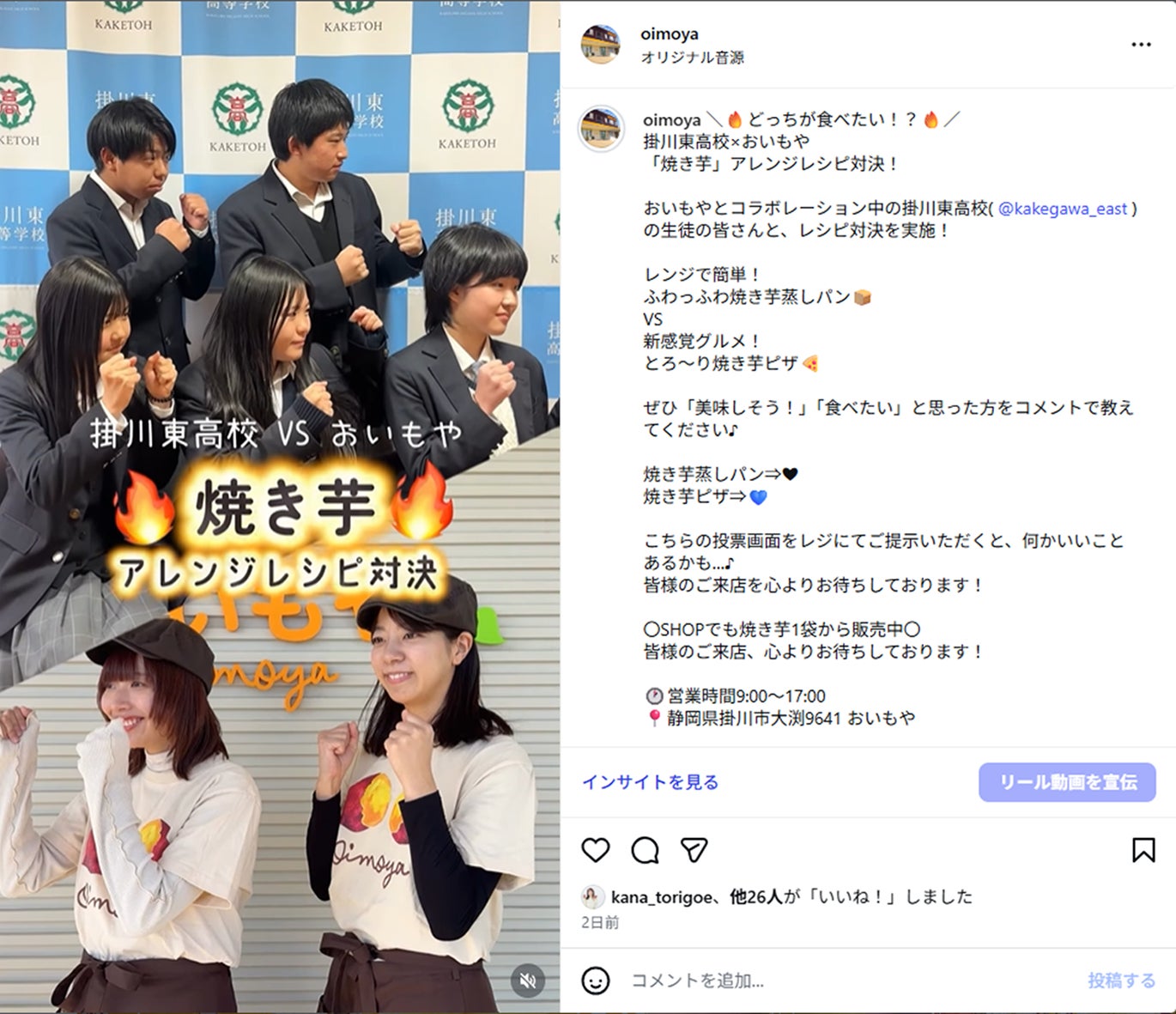 株式会社おいもや(本社:静岡県掛川市、代表取締役:関谷夕佳)は、高校生の探求学習活動と企業のSNS運営課題をマッチングする取り組みを実施し、高校生と共同でInstagram動画コンテンツを制作しました。ASMR動画、ドラマ仕立ての商品紹介、アレンジレシピ動画の3本を投稿し、合計16,000回以上の再生数を記録。若年層への新たなアプローチと、企業・教育双方に価値を生む取り組みとなりました。