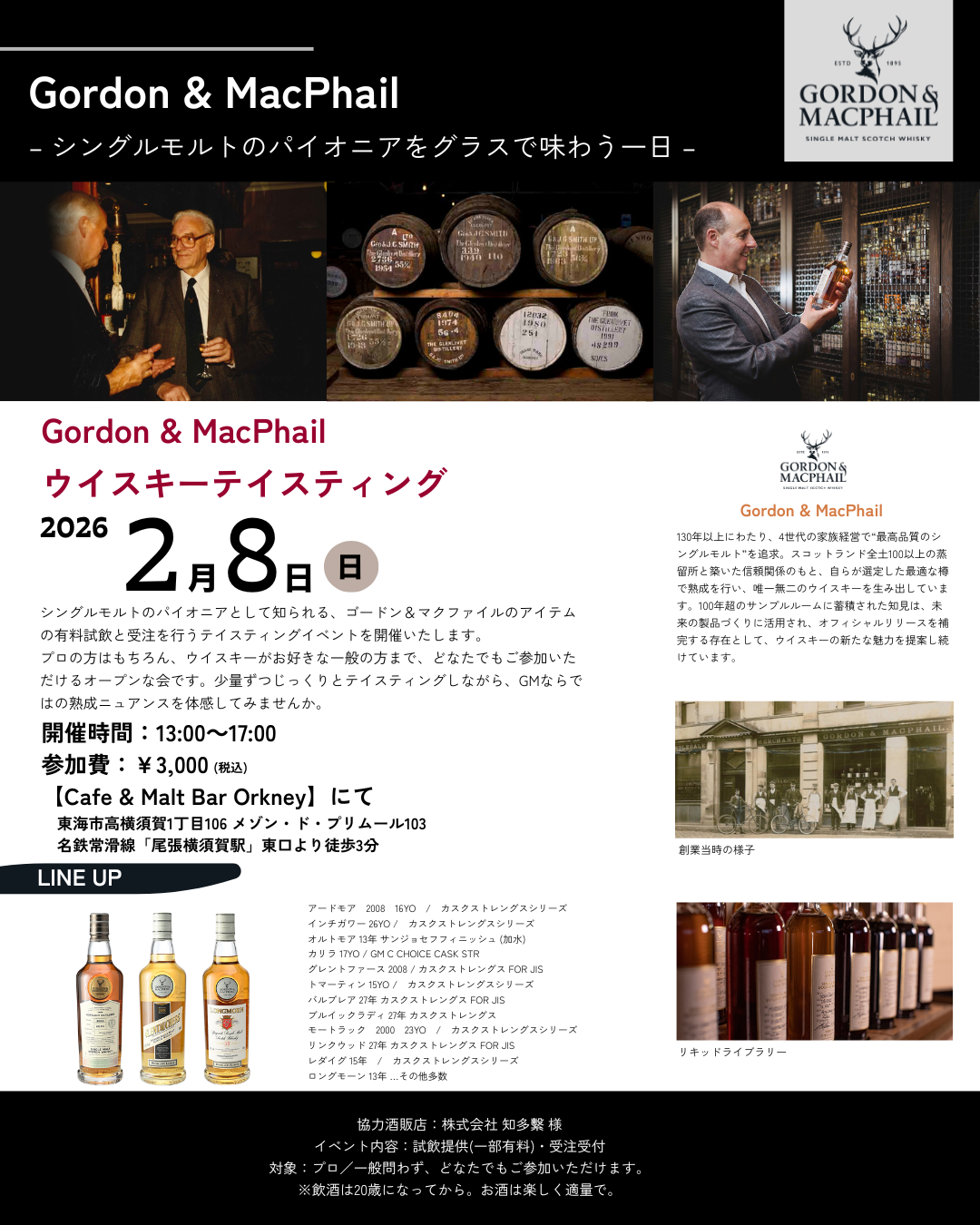 株式会社ジャパンインポートシステム(所在地:東京都中央区/代表取締役社長:田中 克彦)は、ゴードン&マクファイル(以下GM)社の正規代理店として、同社のシングルモルトをグラスでじっくりお楽しみいただけるテイスティングイベント「Gordon & MacPhail ウイスキーテイスティング」を、2026年2月8日(日)に愛知県・東海市の【Cafe & Malt Bar Orkney】にて開催いたします。