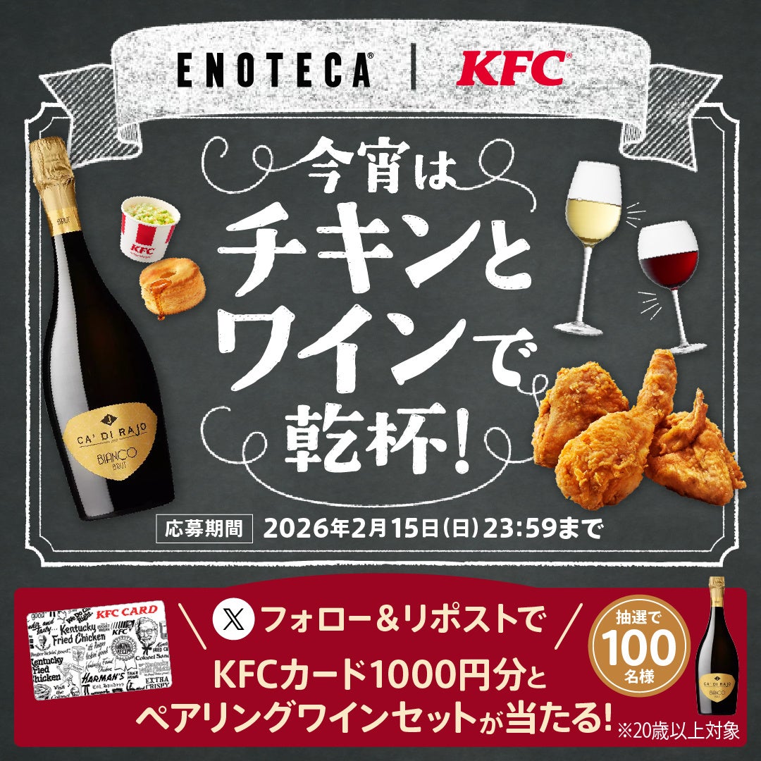 日本ケンタッキー・フライド・チキン株式会社(社長:遠藤 久、本社:神奈川県横浜市、以下:日本KFC)は、エノテカ株式会社(社長:堀 慎二、本社:東京都港区、以下:エノテカ)とのコラボレーションキャンペーンを、2月2日(月)から実施しております。また、本コラボレーションを記念した特設サイトも同日より公開しております。