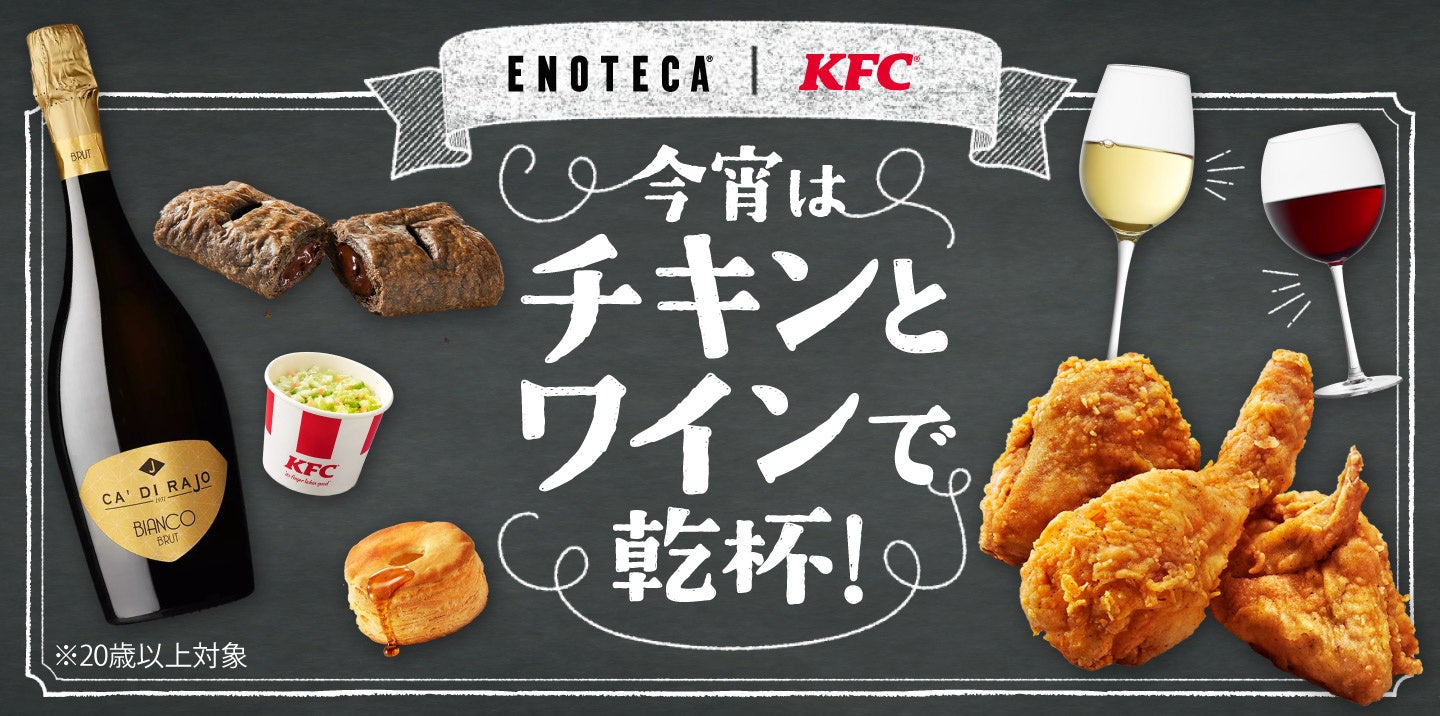 日本ケンタッキー・フライド・チキン株式会社(社長:遠藤 久、本社:神奈川県横浜市、以下:日本KFC)は、エノテカ株式会社(社長:堀 慎二、本社:東京都港区、以下:エノテカ)とのコラボレーションキャンペーンを、2月2日(月)から実施しております。また、本コラボレーションを記念した特設サイトも同日より公開しております。