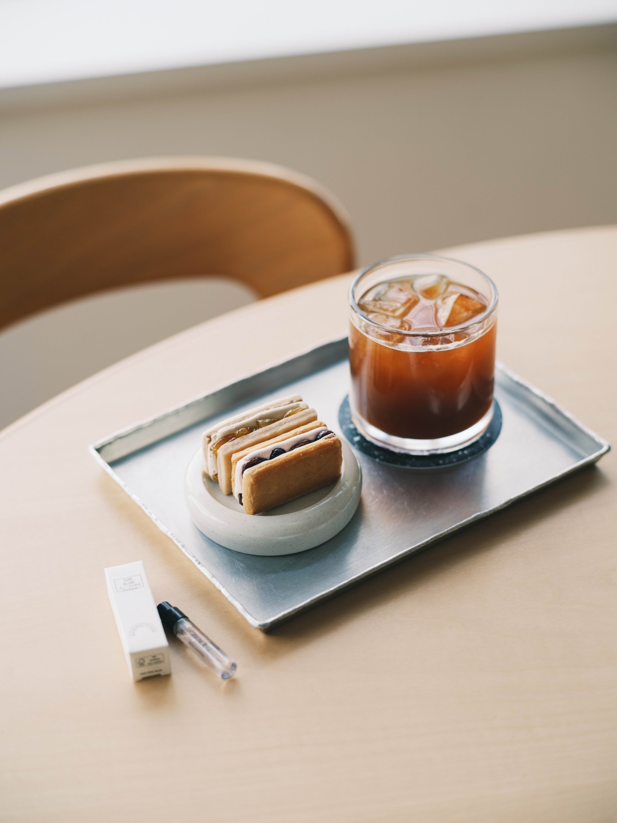 バラの花びらが開く瞬間の、儚い感情と繊細な感覚を描いたNONFICTIONのフレグランス「ザ・ローズ」をイメージした菓子を(NO) RAISIN SANDWICHによる丁寧な手仕事でお届けします。
