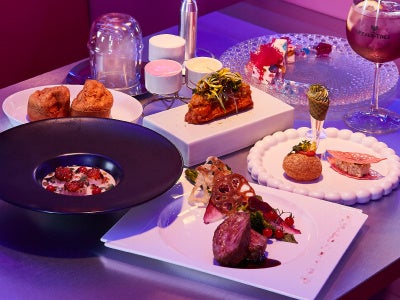 未来の世界をモチーフにしたお食事。近江和牛など7品のコース料理と食前酒