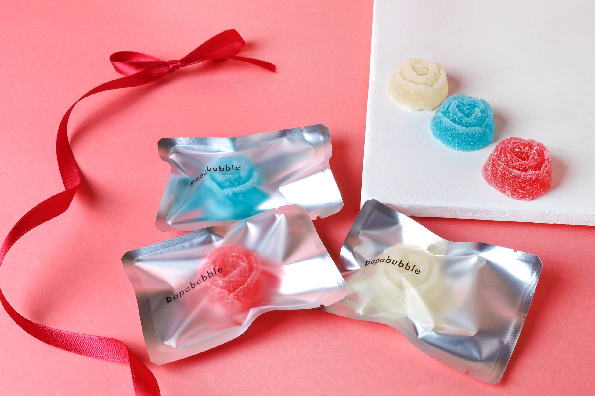 高島屋のシンボルであるバラをモチーフにした、バラ型のバブレッツ(グミゼリー)を3色ご用意しました。ゼリーステージにて、一粒だけアクセントとして選んだり、すべてバラ型で揃えたりと、好みに合わせた組み合わせをお楽しみいただけます。