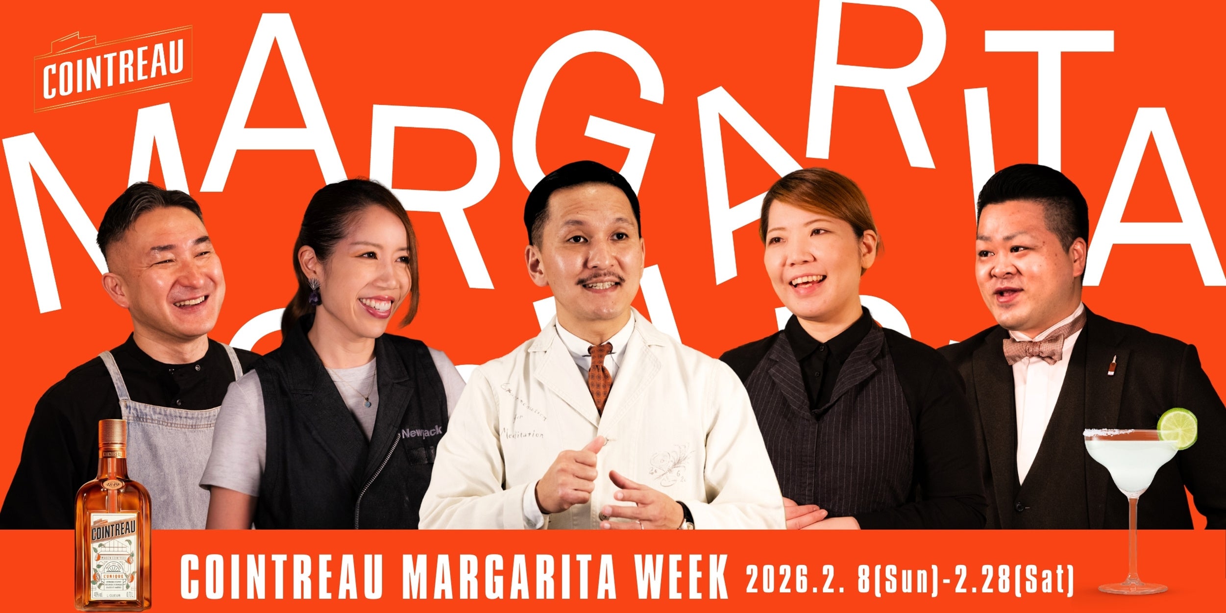 時代を超えて愛され続ける、カクテルの至宝「マルガリータ」。その味わいを支えてきた「コアントロー」は、バーシーンを牽引する圧倒的な感性を放つ5店舗のバーと共に、2月22日の「マルガリータの日」を祝し、皆様と共に楽しむ『コアントロー マルガリータ ウィーク』を実施します。参画するのは、TIGRATO(東京・四ツ谷)、Newjack(神奈川・横浜)、BW CAVE(東京・渋谷)、Flying Bumblebee(東京・代官山)、BAR CONNECT(東京・中野)。各店舗の情熱あふれる気鋭のバーテンダーが、伝統的な「マルガリータ」の起源にまつわるストーリーや味わいの重なり、素材などから再構築した「オリジナル・マルガリータ」をお楽しみいただけます。