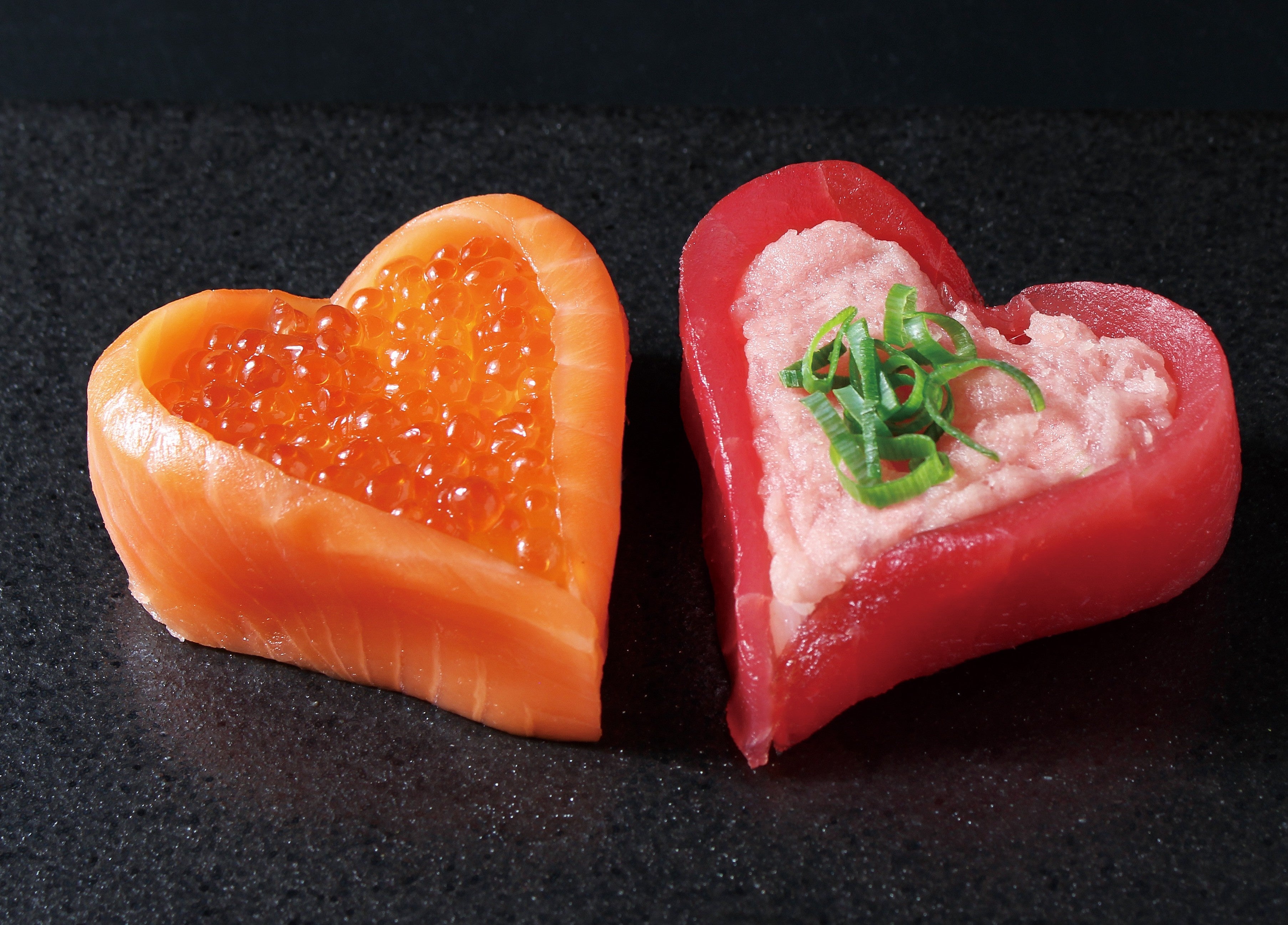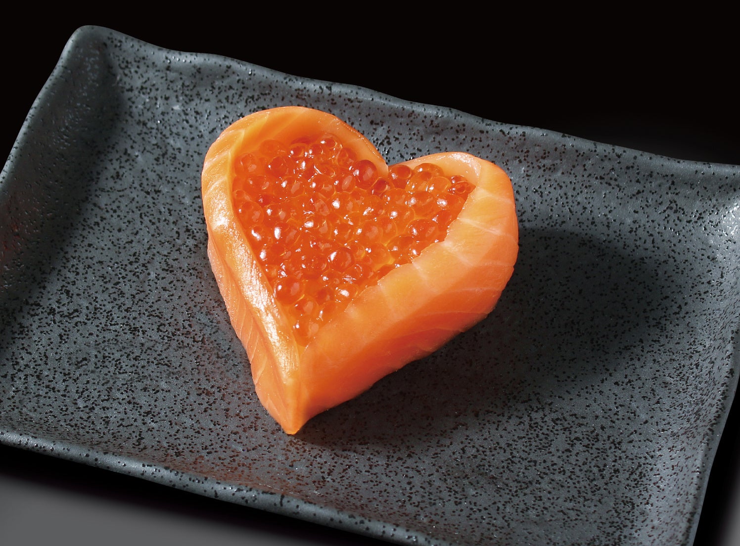 『ハートサーモン』:「銀のさら」人気ネタのサーモンを、「ハート型」に成形し、中央にはイクラをたっぷりと敷き詰め、華やかな一品に仕上げています。大切な人へ「ありがとう」を伝える食卓に、パッと花を添える逸品です。